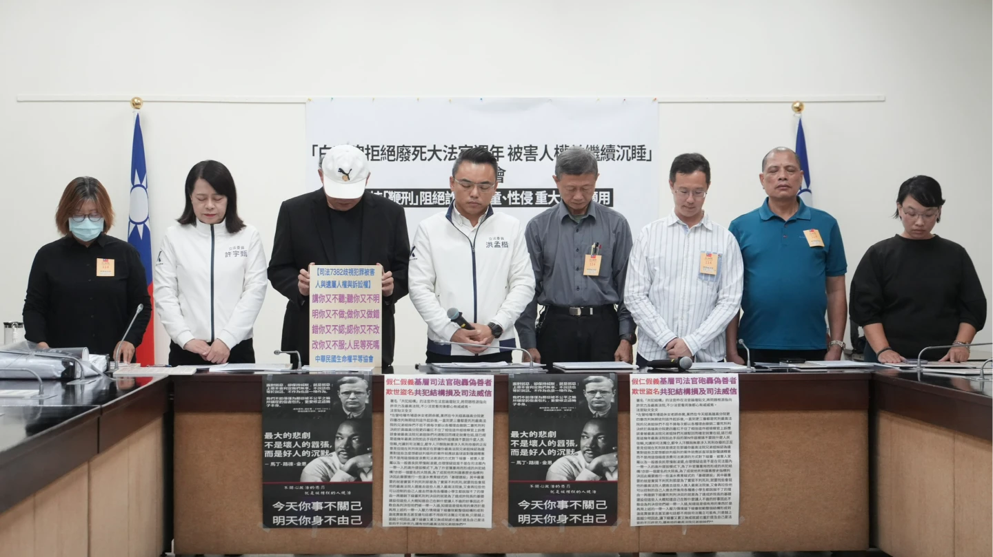 洪孟楷發言時,則說今天是白玫瑰拒絕廢死大法官周年跟師鐸獎女教師命案11週年紀念日,和現場被害者遺屬們默哀10秒鐘。他說,檢察總長邢泰釗為關最久的死囚黃春棋、陳憶隆提非常上訴、2018年發生的「華山大草原分屍案」射箭教練陳伯謙性侵分屍「割乳做標本」卻躲過死刑,中選會沒收反廢死公投,這是對被害家屬無情地拒絕。