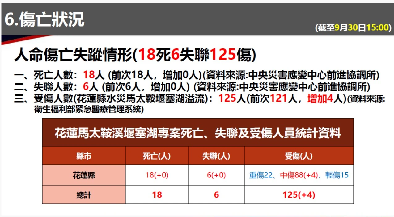 行政院「中央協調所」總協調官、經濟部次長賴建信進行彙報指出,目前馬太鞍溪上游堰塞湖的狀況,容積率已下降至590立方公尺。統計死亡跟失聯總數為24人,其中失聯6人。