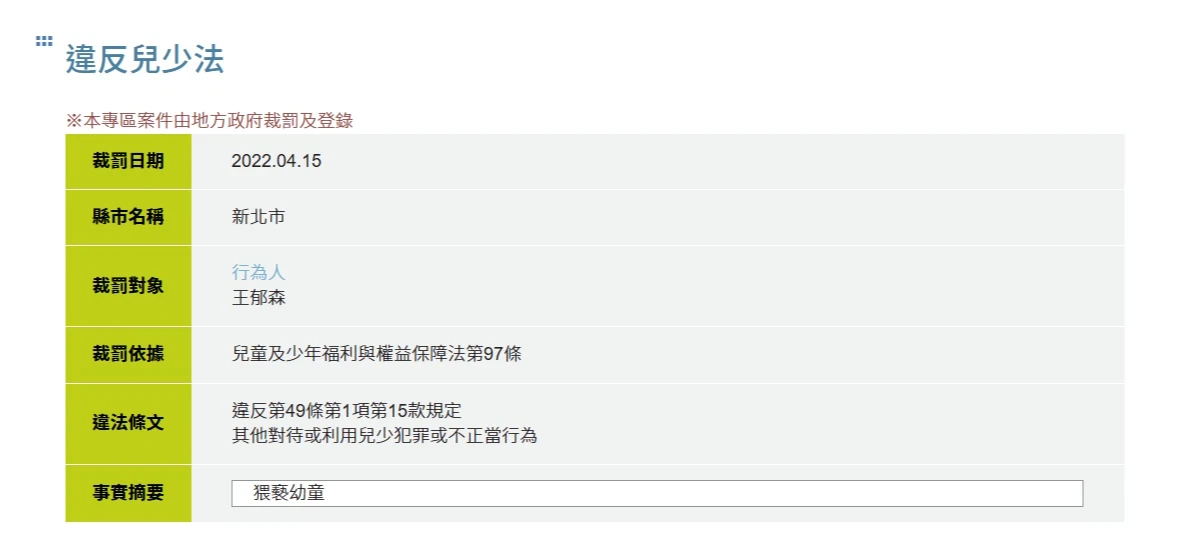 【社會中心/台北報導】近來接連爆發台中松姓棒球教練性侵猥褻數十名男童,以及新北陳姓語言治療師利用治療機會,對多名男童伸狼爪的案件,引發家長人心惶惶。有網友在網路分享可查詢違反《兒少法》的網頁,《知新聞》實測發現,不只台中松姓棒球教練、曾猥褻女童入獄的王姓語言治療師,還有虐死男童剴剴的惡保母劉彩萱、在北市信義區幼兒園性侵偷拍47童的園長兒毛畯珅,都可查到全名和裁罰紀錄,犯行也被揭露。