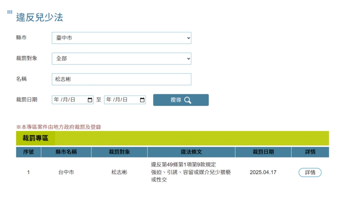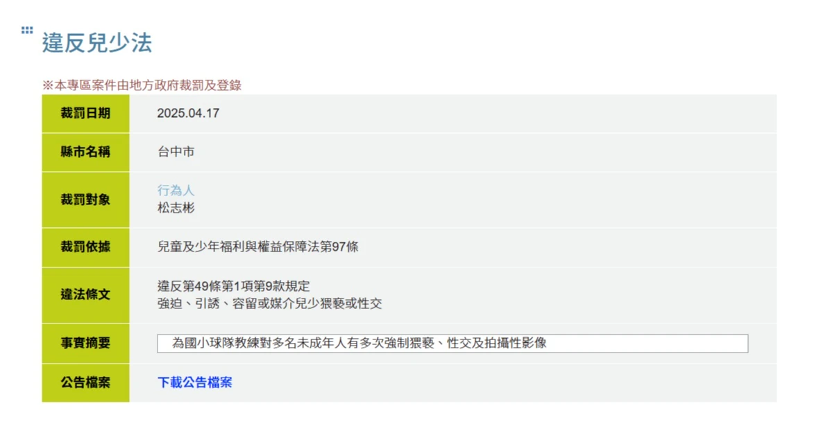 台中松姓棒球教練因性侵猥褻逾80名男童,遭台中地檢署起訴,《知新聞》實際輸入松姓棒球教練全名,可查到網站公告他身為國小棒球教練,卻對多名未成年人有多次強制猥褻、性交及拍攝影像,台中市府根據《兒少法》對他裁罰並依法公告其姓名。