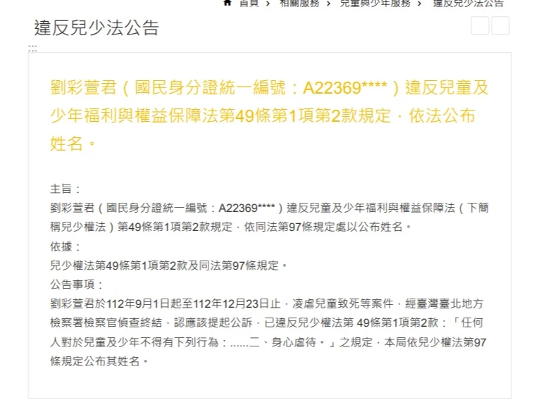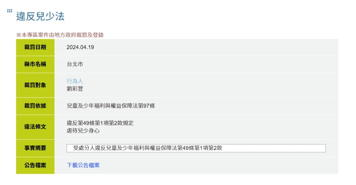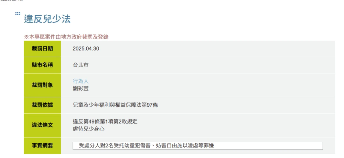 虐死男童剴剴的惡保母劉彩萱,在該平台也有兩筆公告,其一是虐死男童剴剴,2024年4月19日遭北市府裁罰;另一筆則是2025年4月30日,因另凌虐2名受托幼童,再遭裁罰。