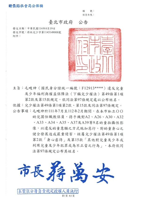 北市信義區某幼兒園長兒子毛畯珅,因性侵猥褻還偷拍47童,遭法院先後判刑28年8月定讞及30年,CRC資訊網輸入毛男姓名,也可查到他遭裁罰的紀錄和全名。
