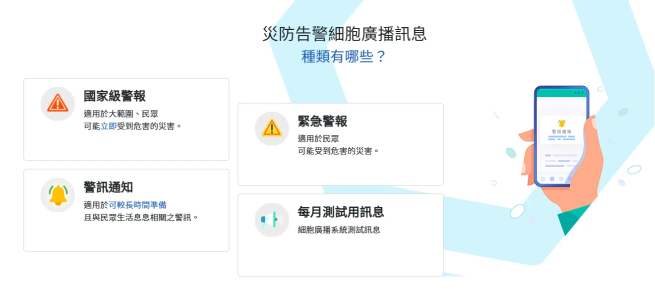 災防告警細胞廣播訊息分為四種,包括適用於大範圍、民眾可能立即受到危害的災害的「國家級警報」、民眾可能受害危害的「緊急警報」、適用於可較長時間準備且與民眾生活息息相關之警訊的「警訊通知」和此次細胞廣播系統測試訊息。