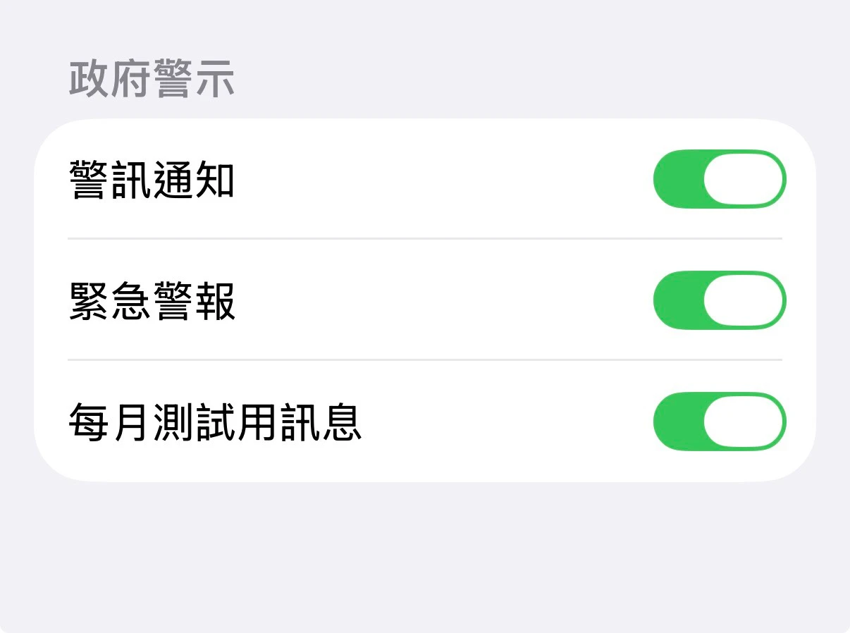 iPhone用戶可進入手機的「設定」,在「通知」選項中找到「政府警示」,將「每月測試用訊息」關閉。相對的,若擔心沒收到通知,也可來此檢查確認是否有開啟通知。
