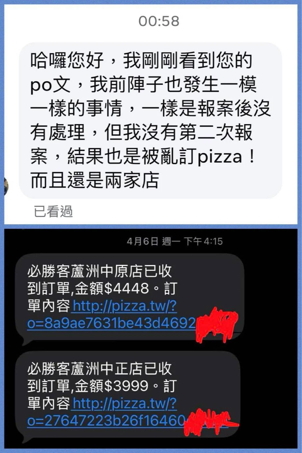 豈料,昨天有另名網友也在社群發文指出,他跟何男遇到相同狀況,同樣是首次報案後警方沒處理,檢舉第二次車輛違停後,就收到兩家必勝客訂單,金額分別為4448元和3999元,這名網友昨天已前往蘆洲警分局蘆洲所報案。
