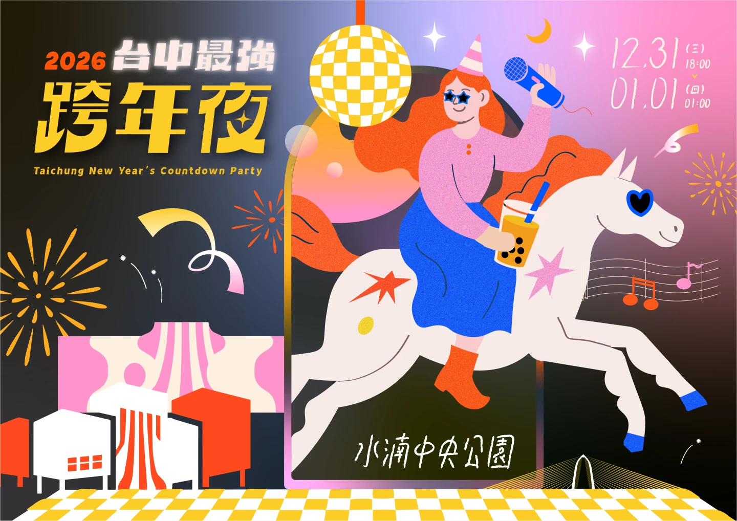 2026台中最強跨年夜集結蕭敬騰、盧廣仲、動力火車及告五人等重量級表演嘉賓,邀請全國民眾一同來台中水湳中央公園迎接新年。