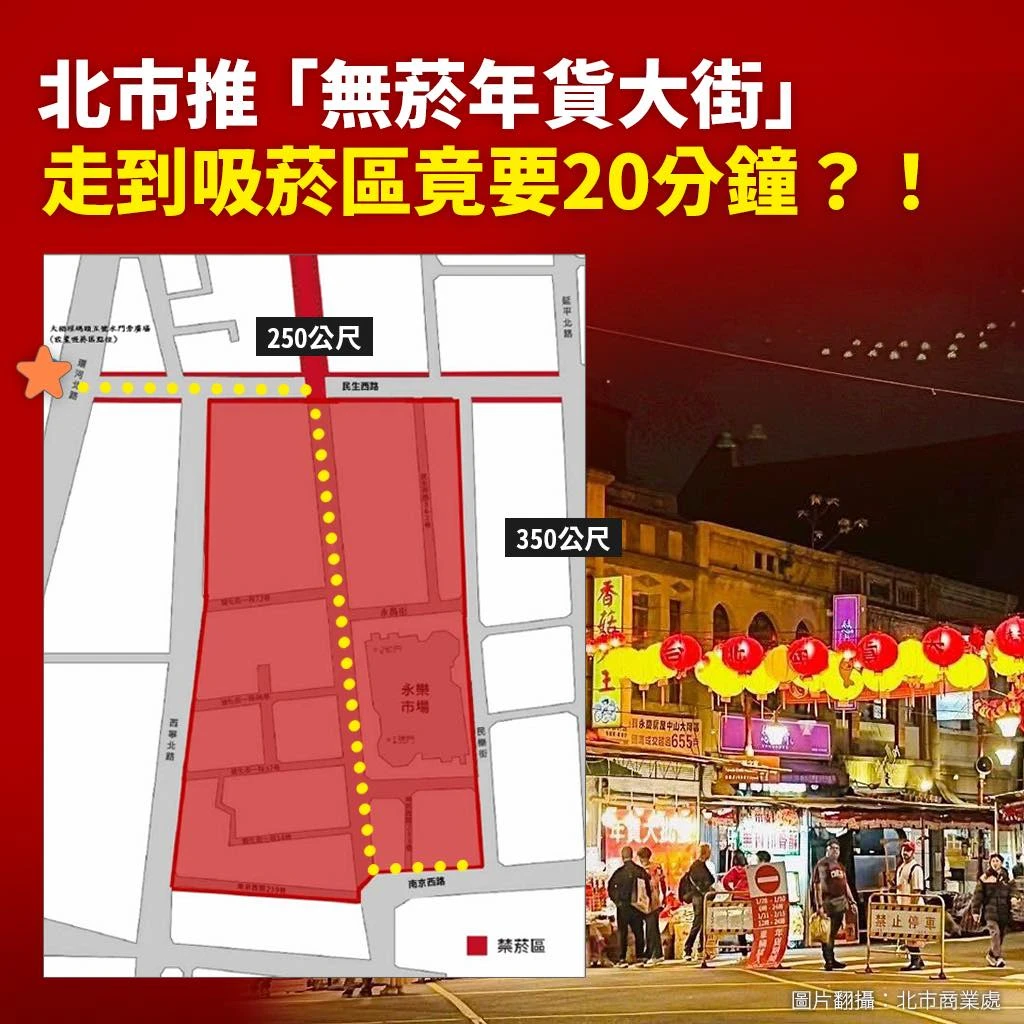 民進黨北市議員林亮君透過臉書表示,自己不喜歡菸味對此政策樂觀其成,但執行方法是大笑話。天才蔣萬安把吸煙區設置在「大稻埕碼頭(五號水門)」外,民眾前往年貨大街,多半從南京西路-迪化街-民樂街這個區域進入。想在吸菸區抽菸,得穿過擁擠人潮,穿過好多攤位,走600公尺抵達大稻埕碼頭,才能抽上一根菸,來回大概要20分鐘。走到菸癮都沒了。