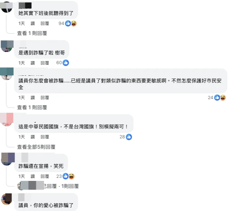 然而江和樹文章一刊登,網友隨即湧入留言戳破真相。許多民眾指出這是盛行已久的「國旗詐騙」手法,紛紛留言調侃:「她其實下班後就聽得到了」、「身為議員對詐騙要更敏感啊」、「議員你怎麼會被詐騙.....已經是議員了對類似詐騙的東西要更敏感啊。不然怎麼保護好市民安全」、「遇到詐騙了!都沒看新聞」、「這是在造勢場合領免費國旗再拿來賣」。甚至有在地網友直言,曾在太平、東區等多處路段看過她出沒。