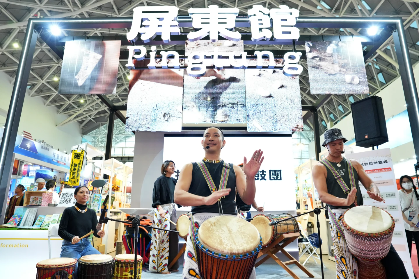 今天開館表演,特別邀請到恆春在地「搖搖樂非洲鼓樂團」,傳統排灣族舞蹈結合鼓樂,熱鬧揭開序幕。屏縣府交旅處表示,今年聯合屏東縣觀光協會、民宿協會、恆春半島等各大觀光產業聯盟,以及老莫可可農園、南國紅逗等在地精選商家共同參與,推出旅展限定的各種好康,讓民眾深刻感受南國旺盛的活力。