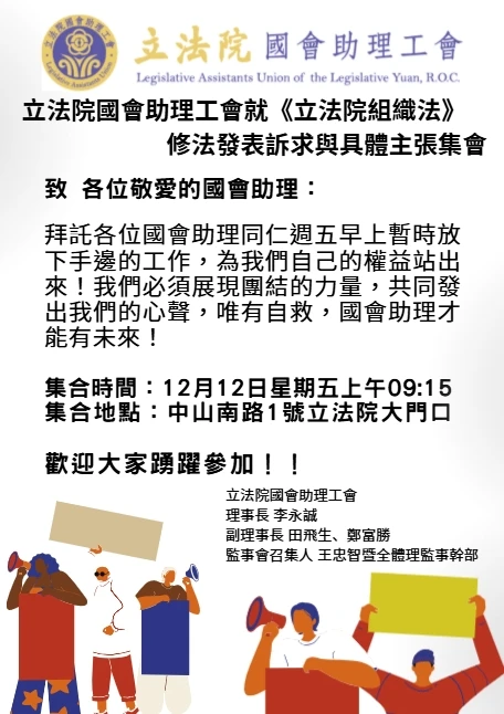 國會助理工會12日上午9時15分,呼籲國會助理在立法院大門口集合,此邀請並由助理工會理事長李永誠;副理事長田飛生、鄭富勝;監事會召集人王忠智暨全體理監事幹部共同邀請。