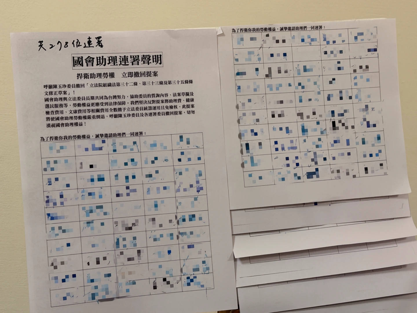 陳秀寳續道,立委不能因為自己的想法、私心,私自破壞制度,這些規範、制度,或許不是非常的完美,但應該也有八十分的。陸陸續續參加聯署的助理已經將近三百位,也許有些辦公室有壓力,但這是所有助理的事,不分黨派、派系,大家都應該要發聲,「大家不要怯懦,這是你們應該做的,捍衛自己的權利,我們也會一直陪伴在身邊,大家一起努力」