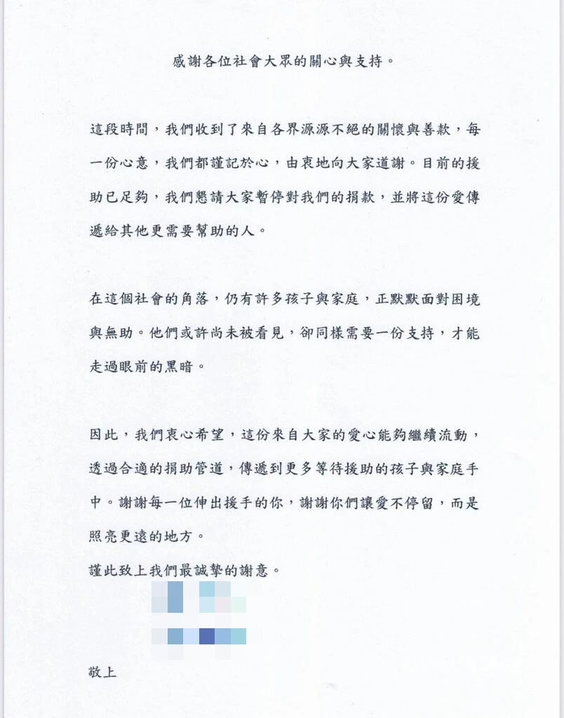這段時間,我們收到了來自各界源源不絕的關懷與善款,每一份心意,我們都謹記於心,由衷地向大家道謝。目前的援助已足夠,我們懇請大家暫停對我們的捐款,並將這份愛傳遞給其他更需要幫助的人。