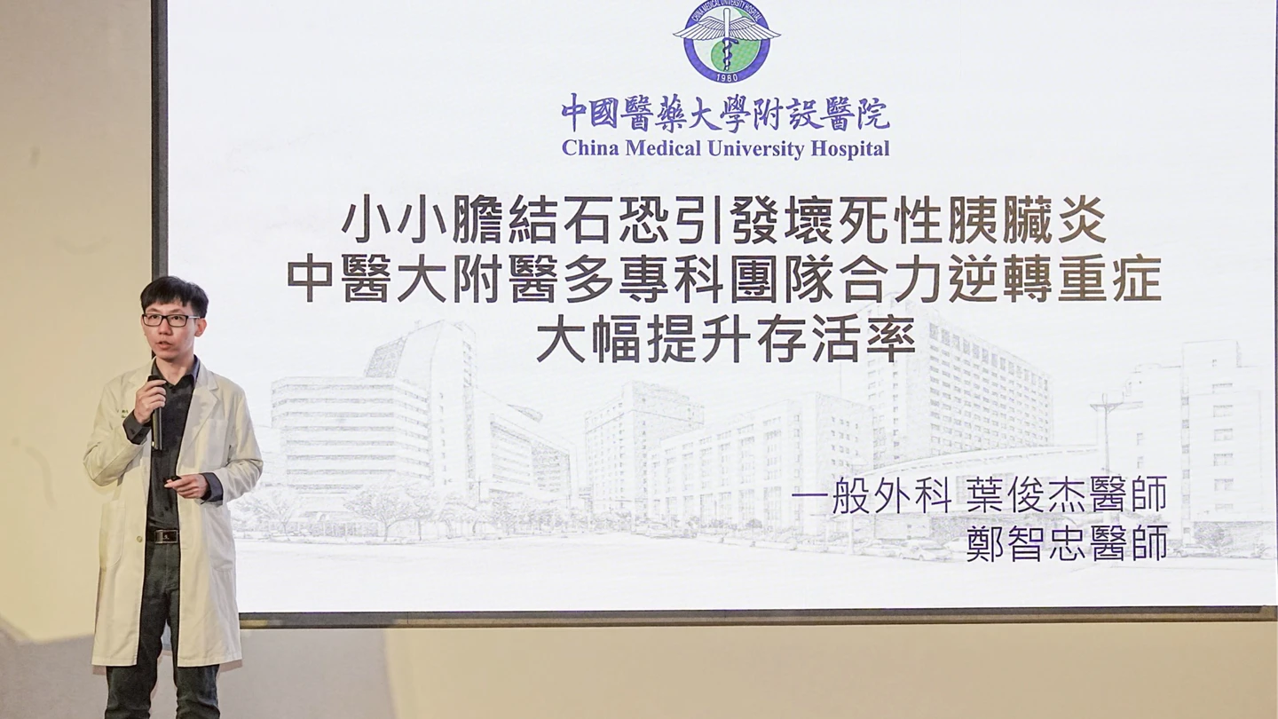 中醫大附醫一般外科醫師鄭智忠表示,許姓男子過去無胰臟疾病病史,初期僅出現上腹疼痛,未料病情迅速惡化,經檢查確認為膽結石阻塞胰管,引發急性且嚴重的壞死性胰臟炎,屬高風險重症,醫療團隊隨即啟動整合照護機制,由內科、外科及放射診療科跨科合作,分階段進行治療。
