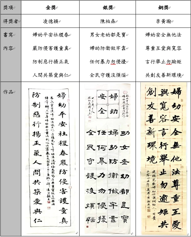 書法創作組金獎凌德穎、銀獎陳柏森、銅獎李黃瀚。恭喜以上得獎者,而每件得獎作品都蘊含著一則故事、一份情感與一份希望,激勵著我們持續努力,共同營造更安全的生活環境。