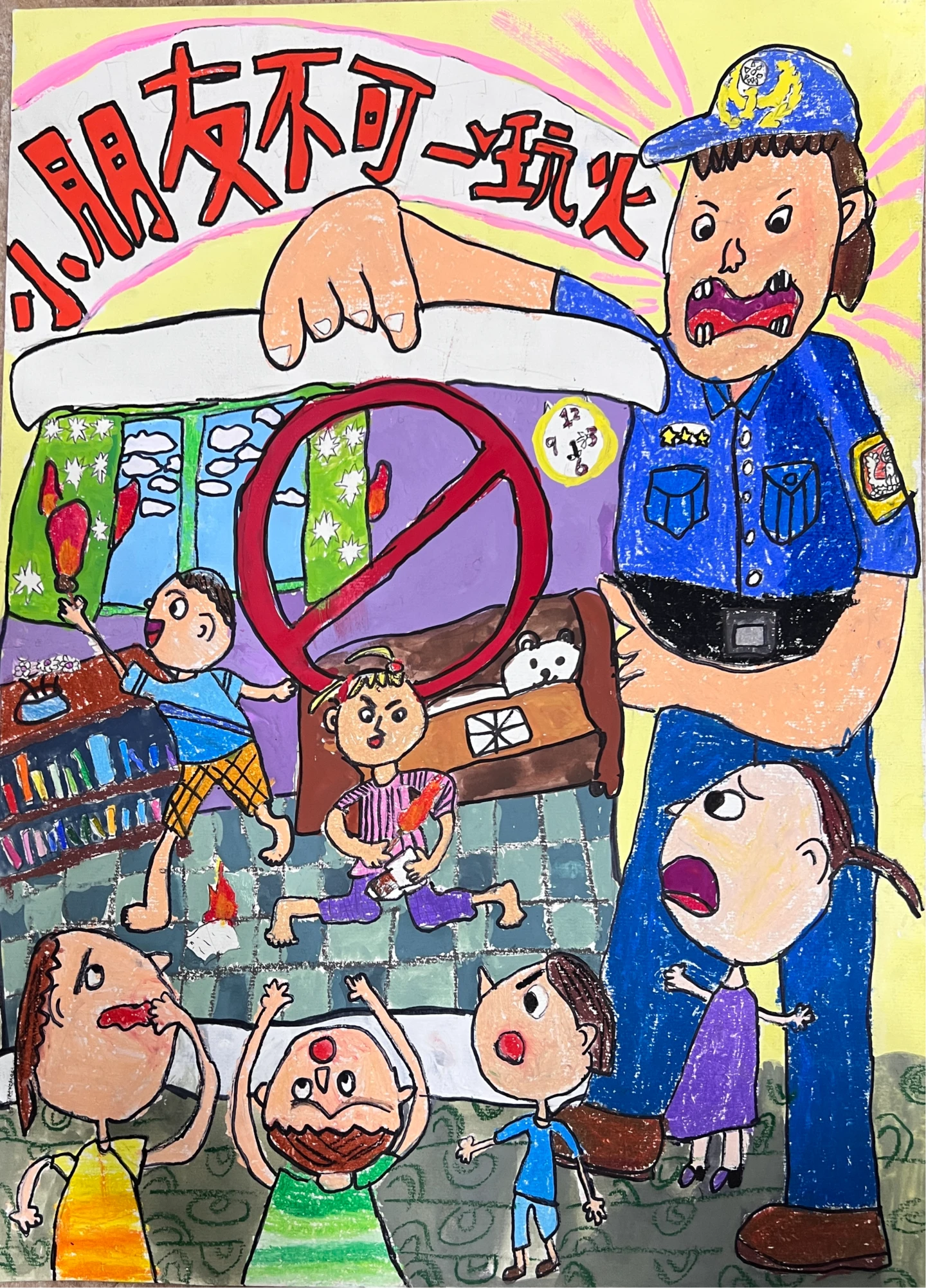 其中「國民小學海報創作」得獎作品區分低、中、高年級組別,低年級組:金獎鄭語心(作品:小朋友不可以玩火)、銀獎張宸熙(作品:不拿陌生人食物)、銅獎陳楷崴(作品:不拿陌生人給的糖果)。