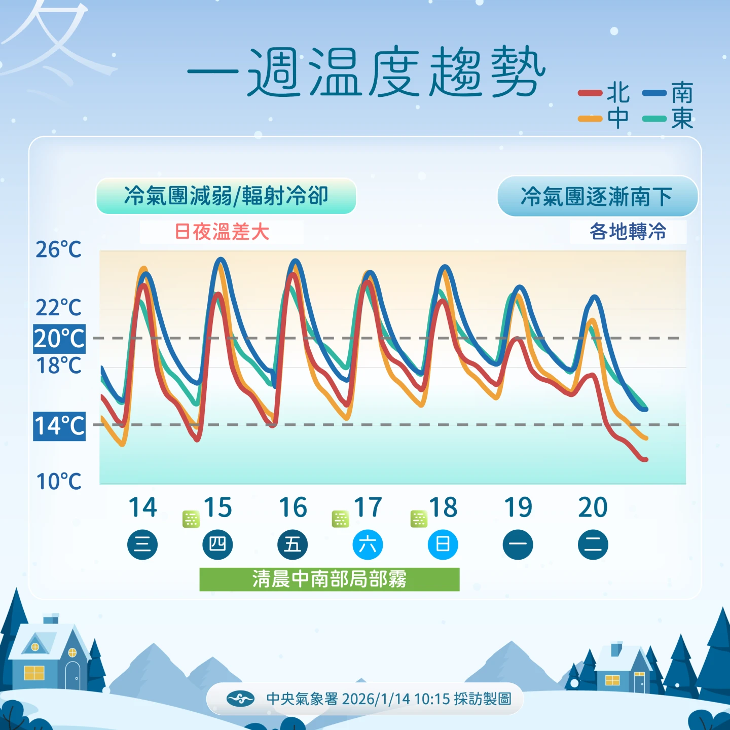 白天北部及東半部高溫約23至25°C,中南部可達27至28°C,日夜溫差明顯。澎湖晴時多雲,氣溫17至21°C;金門12至20°C;馬祖12至18°C。水氣偏少,各地多為多雲到晴,僅台東及恆春半島有零星短暫雨;清晨桃園以南地區易有局部霧或低雲影響能見度。