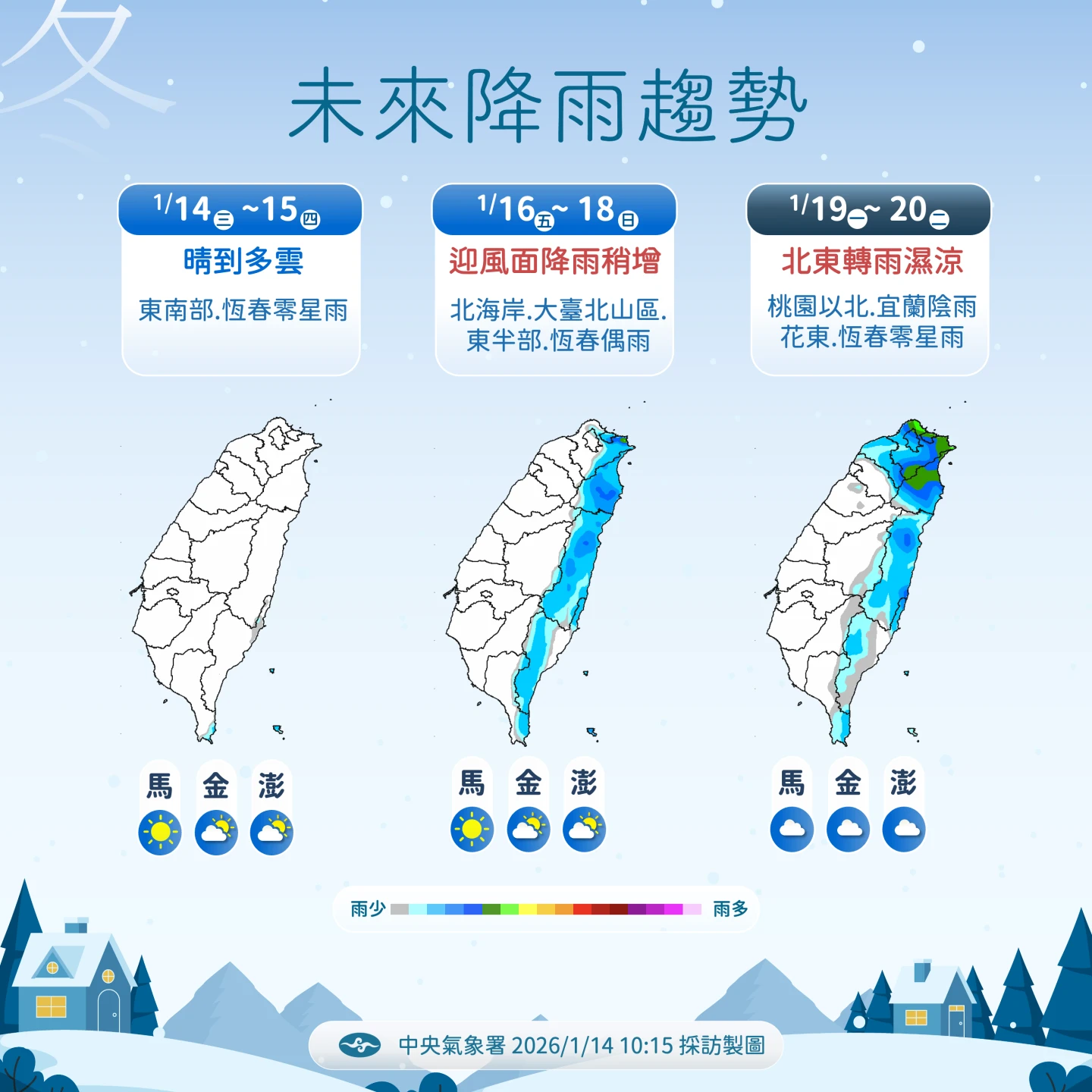 氣象署指出,明(16日)起迎風面降雨漸增,迎風面的基隆北海岸、大台北山區、東半部及恆春半島轉為有局部短暫雨,其他地區維持多雲到晴。明起至周日(18日)各地早晚仍涼,中南部日夜溫差依然偏大。