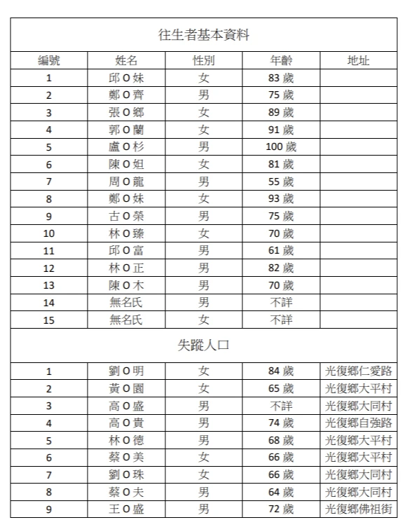 此外,9名失聯者也多為64歲到80歲的年長居民,地點多在光復鄉中學街、仁愛路、大平村、大同村和中正、自強路。
