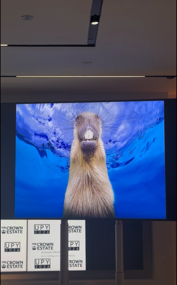 在主審暨海洋生物學家馬斯塔德(Alex Mustard)主持的獲獎名單揭曉儀式上,水豚特寫照片公布在巨型螢幕那一刻,現場立即響起「哇」的驚呼聲和掌聲。
