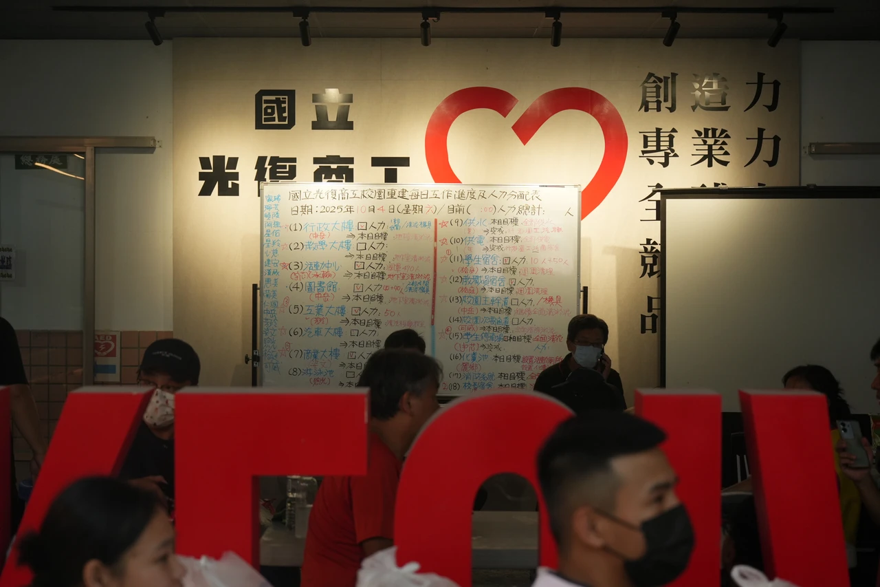 《知新聞》記者在9/4、災後第12天,進到光復商工校園,適逢中秋連假,校園內有大批志工前來協助,有人忙著清掃校內中庭的泥土、剷除大型機具進不去的空間的泥沙,也有專業水電團隊幫忙建立臨時水電管路,還有大型機具進駐。