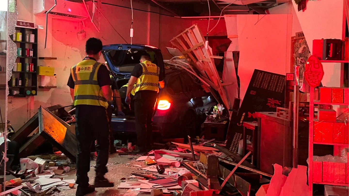 台中市消防局在今天凌晨3點21分獲報,西區五權路一段與五權路交叉口一家茶行,發生車輛衝入事故,立即派遣中區、中港及大誠分隊共5輛消防車、14名人員前往搶救。
