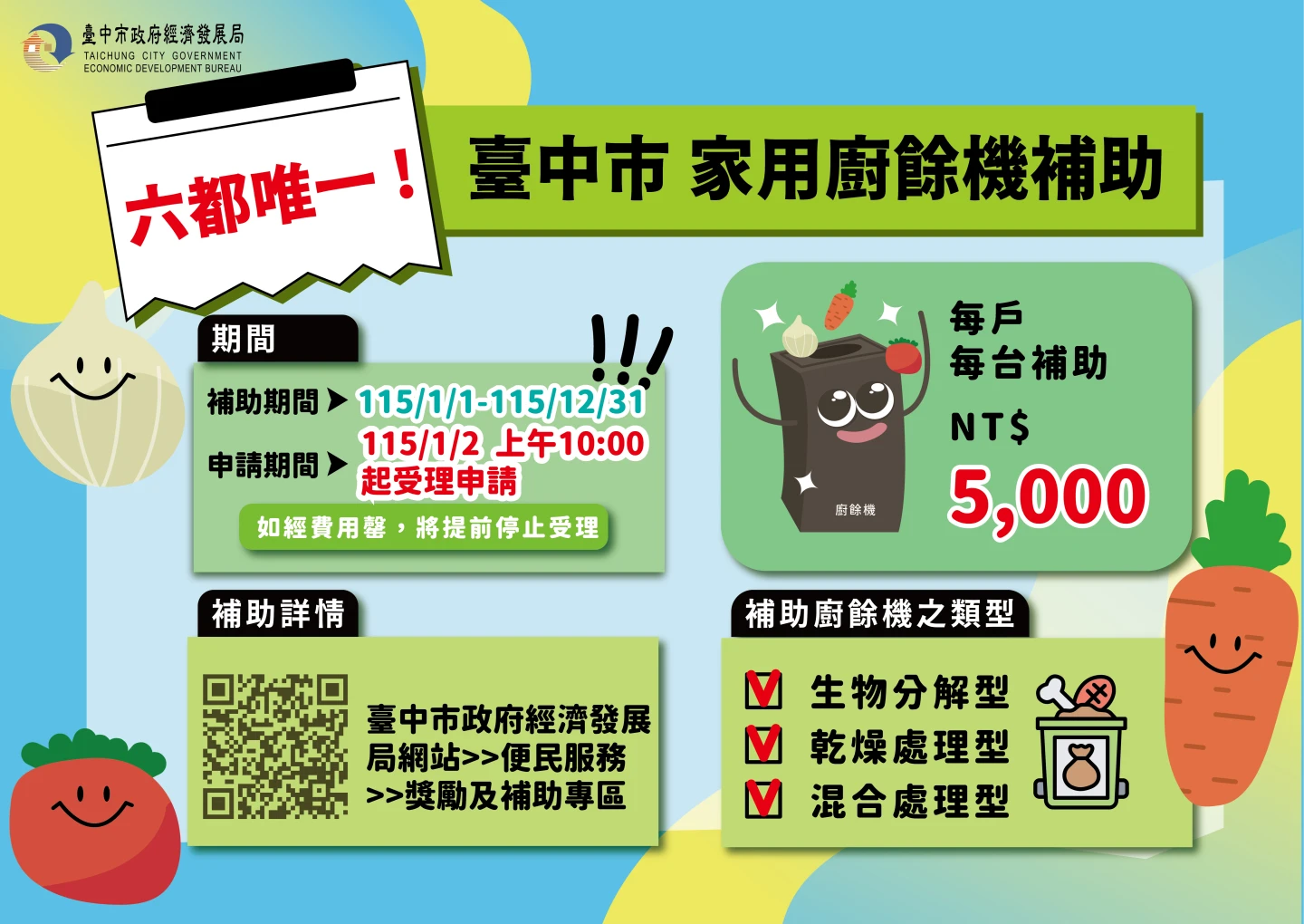 台中市家用廚餘機補助涵蓋「生物分解型」、「乾燥處理型」及「混合處理型」三大類家用廚餘機,每台補助金額最高5000元,每戶限補助1台,僅補助機體購置費用,不包含耗材,而粉碎型及冷藏冷凍型廚餘機則不在補助範圍內,採線上申請,1月2日開放申請首日,網頁一度因同時湧入逾5000人,導致網頁出現延遲或短暫無法連線情形。