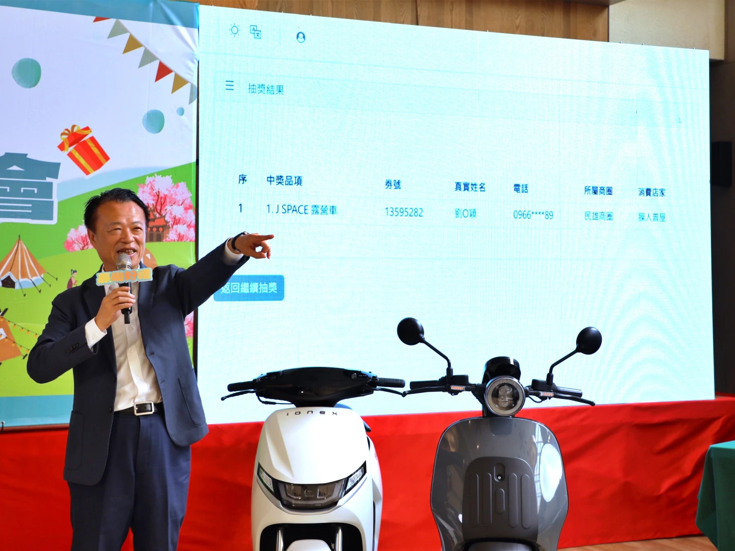 今天直播抽獎中,翁章梁親自抽出沙發按摩椅、光陽電動機車、Gogoro,以及最受矚目的J SPACE露營車等4項大獎。翁章梁致電露營車幸運得主劉先生時,先幽默自我介紹「我不是詐騙集團」,對方仍不可置信,頻問「這是真的嗎?」非常開心中大獎。