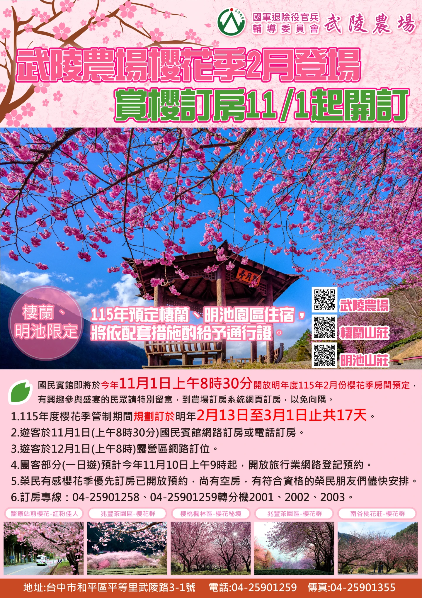 武陵農場表示,為方便遊客規劃行程,將於11月1日早上8:30開放國民賓館115年2月份之訂房;而露營區將於12月1日早上8:00開放115年2月份之訂位。