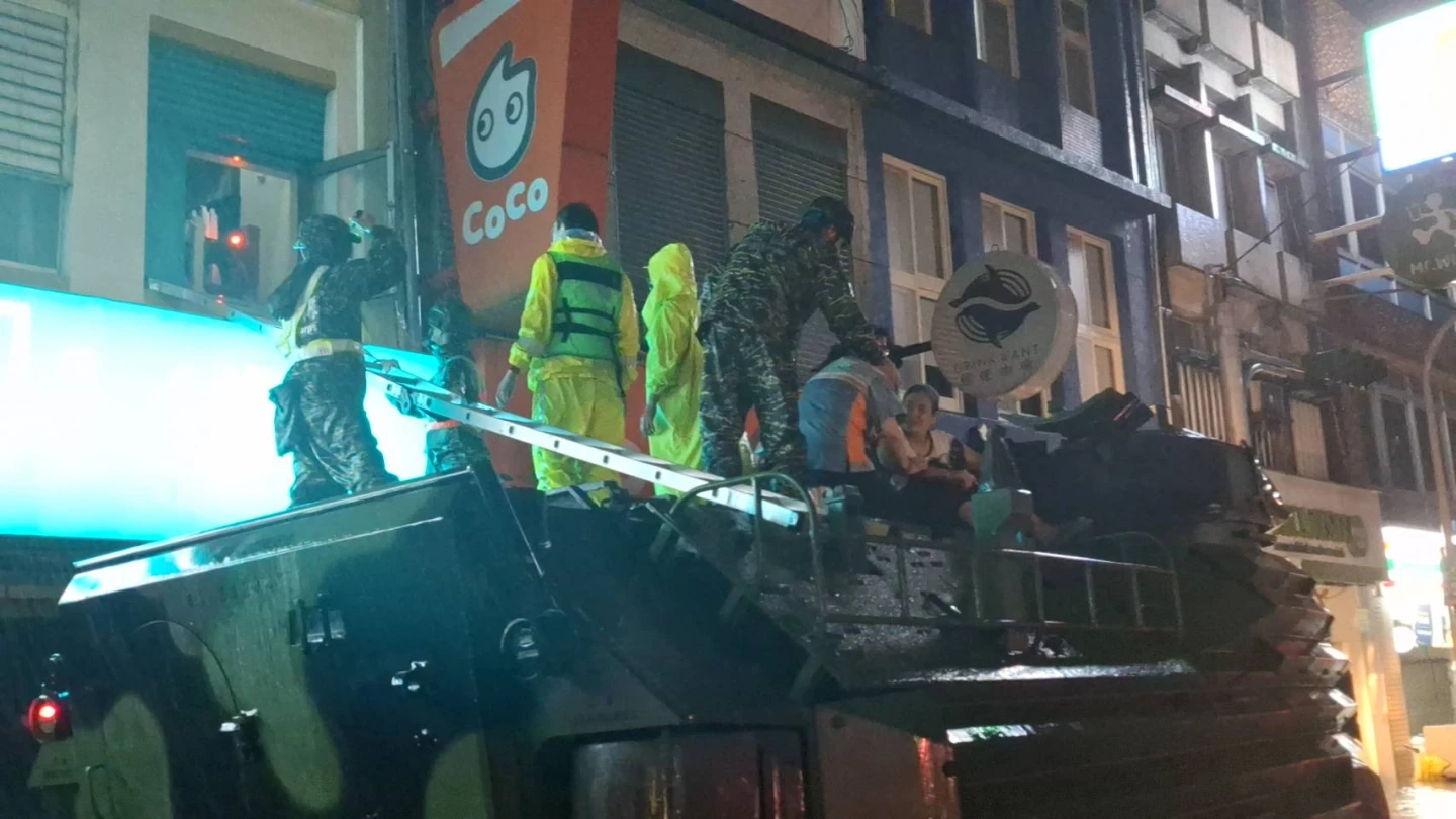 軍方在暴雨中緊急出動𝗔𝗔𝗩𝟳兩棲戰車、偕同消防救生艇深入積水處,在蘇北里長陳添琪指引下,一一帶出受困民眾。