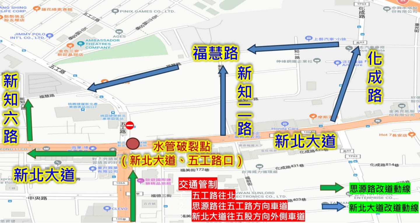 ㄧ、改走新北大道、新知二路或新北大道、化成路行經福慧路前往泰山、五股地區,以避開管制路段。