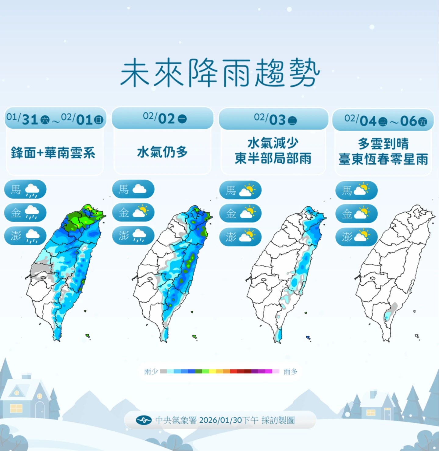 周日至周二最冷 先濕後乾降雨由西向東漸歇