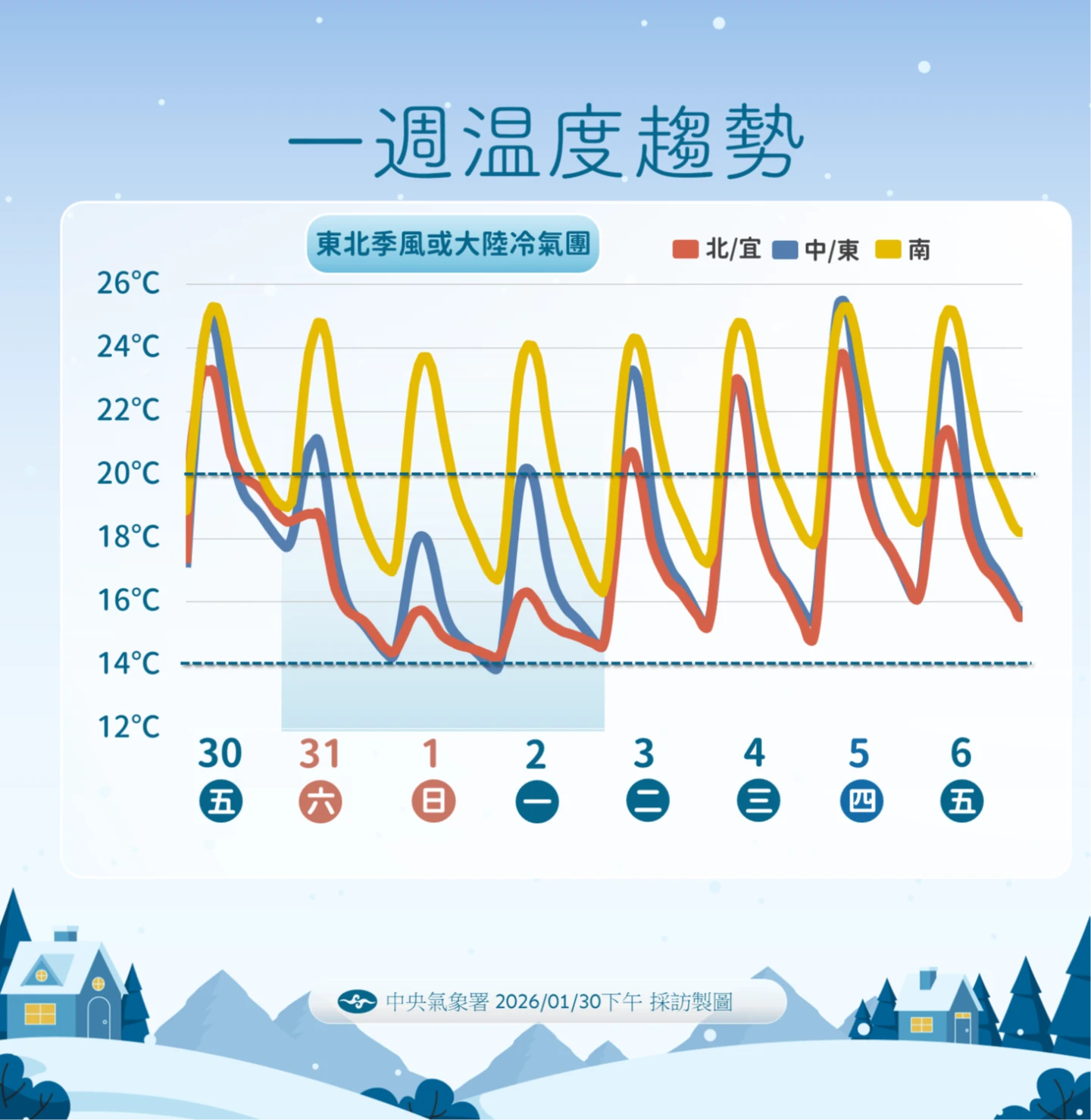 台灣大學大氣科學博士林得恩在臉書「林老師氣象站」發文表示,今晚至明晨,台灣中部以北及宜蘭地區最低溫預估在攝氏13至15度之間,南部及花東地區則在15至19度,最冷時間會落在2/1至2/3清晨。氣象專家吳德榮則在「洩天機教室」撰文指出,預料入夜之後氣溫直墜,本島平地最低氣溫約可降至12度,台北測站氣溫接近15度。由於濕度增加,體感溫度會覺得更冷,特別是長輩及心血管疾病患者,應適時增添衣物保暖。