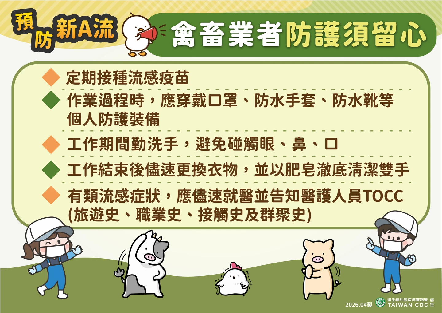 疾管署防疫醫師林詠青表示,禽畜業者工作時容易接觸到禽畜的呼吸道分泌物或排泄物,因此感染新型A型流感的風險比一般人高,建議定期接種季節性流感疫苗,工作時佩戴口罩、防水手套、防水靴,避免接觸眼、口、鼻等粘膜部位。工作結束後儘速更換衣物、用肥皂徹底洗手。
