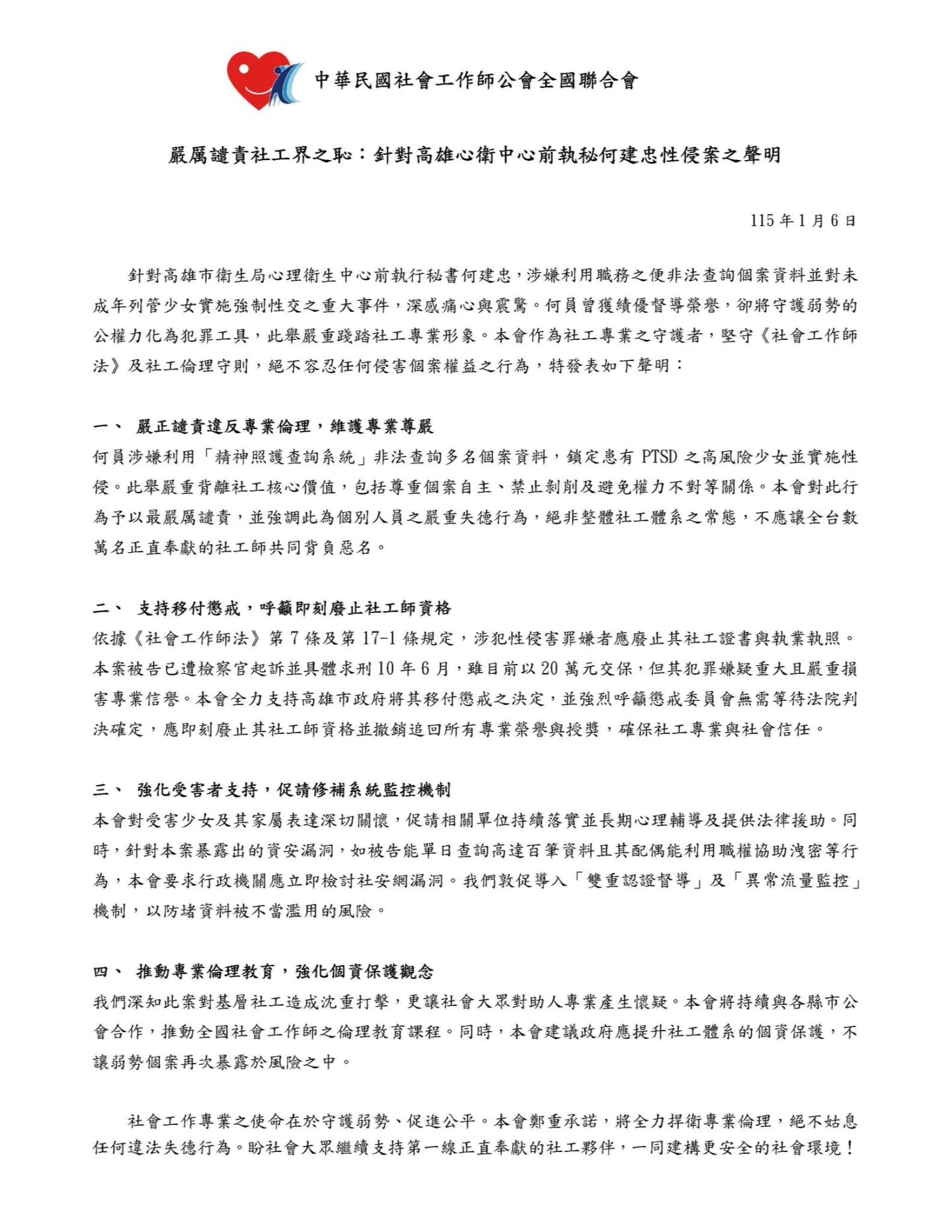 何員涉嫌利用「精神照護查詢系統」非法查詢多名個案資料,鎖定患有PTSD之高風險少女並實施性侵。此舉嚴重背離社工核心價值,包括尊重個案自主、禁止剝削及避免權力不對等關係。本會對此行為予以最嚴厲譴責,並強調此為個別人員之嚴重失德行為,絕非整體社工體系之常態,不應讓全台數萬名正直奉獻的社工師共同背負惡名。