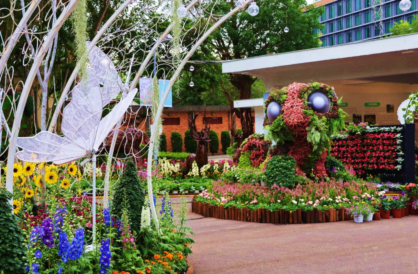 一踏入園區,首先迎接的是以熱氣球、飛行器與彩色花卉組成的「藝菊圓夢」展區,象徵夢想乘風而起,成打卡必訪的第一站。接著來到「向陽築夢」,展區中陸續盛開向日葵迎光綻放。緊接著由觀葉植物與造型菊共同打造的「夢花園」則充滿童趣與想像力,公園處園藝團隊打造的主角變色龍「花傻傻」與牠的蝴蝶、狐狸、大象、小鹿等夥伴們,各自象徵不同性格與力量。