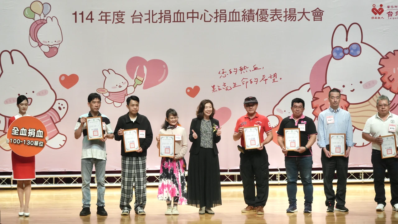 台北捐血中心今(19)日舉行「114年度捐血續優表揚大會」。根據統計,114年度個人捐血表揚人數共計達7958人。其中,表揚全血捐血績優者4931人、分離術捐血績優者3027人;在團體獎項方面,包括8個績優學校、143個企業與社團單位,以及3個績優部隊與11個特殊貢獻單位,展現社會各界對捐血公益的全力支持。