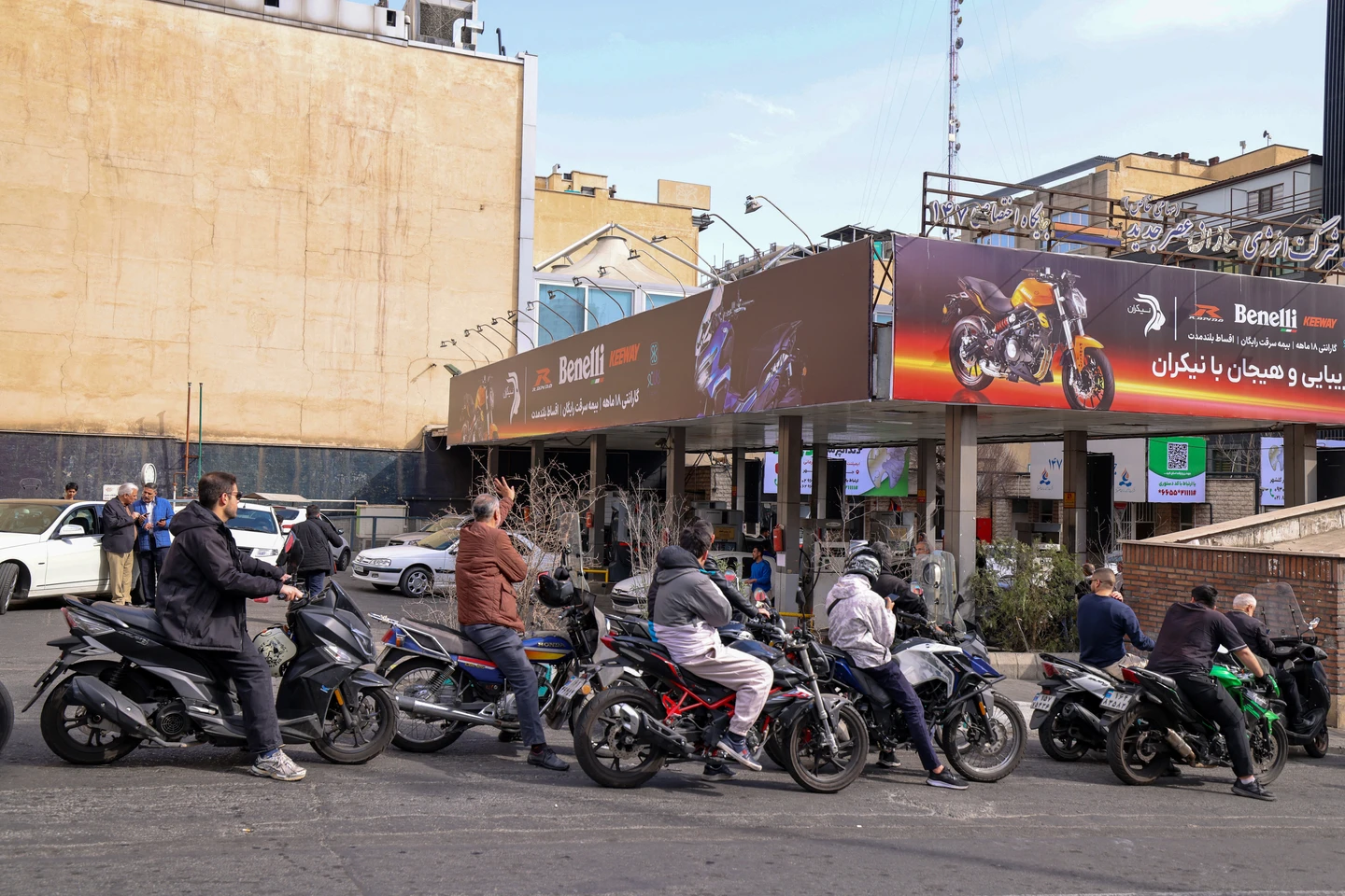 伊朗大批機車騎士,2月28日在德黑蘭一家加油站外排隊加油。法新社