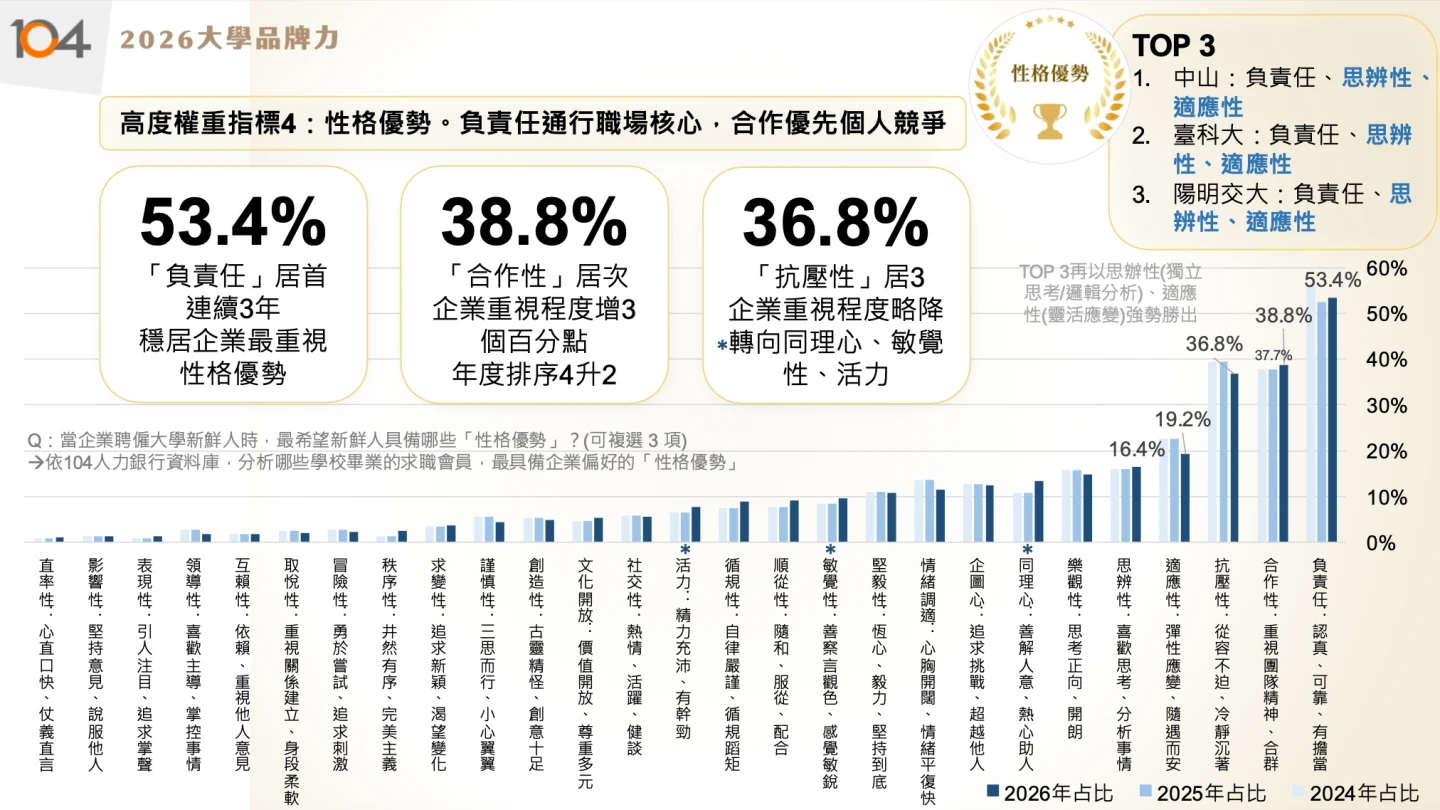 另外,王榮春說,學群聘僱力指的是企業聘用該校特定學群畢業生的意願和評價,像是政大因學群集中商管社科,因此理工學群聘僱力分數較為受限;性格優勢則是重視學生的軟技能和個人特質,企業最在意的是負責任、合作性,以及抗壓性。