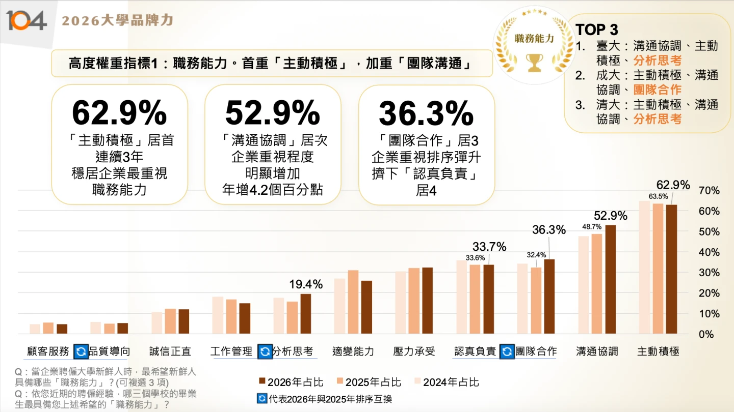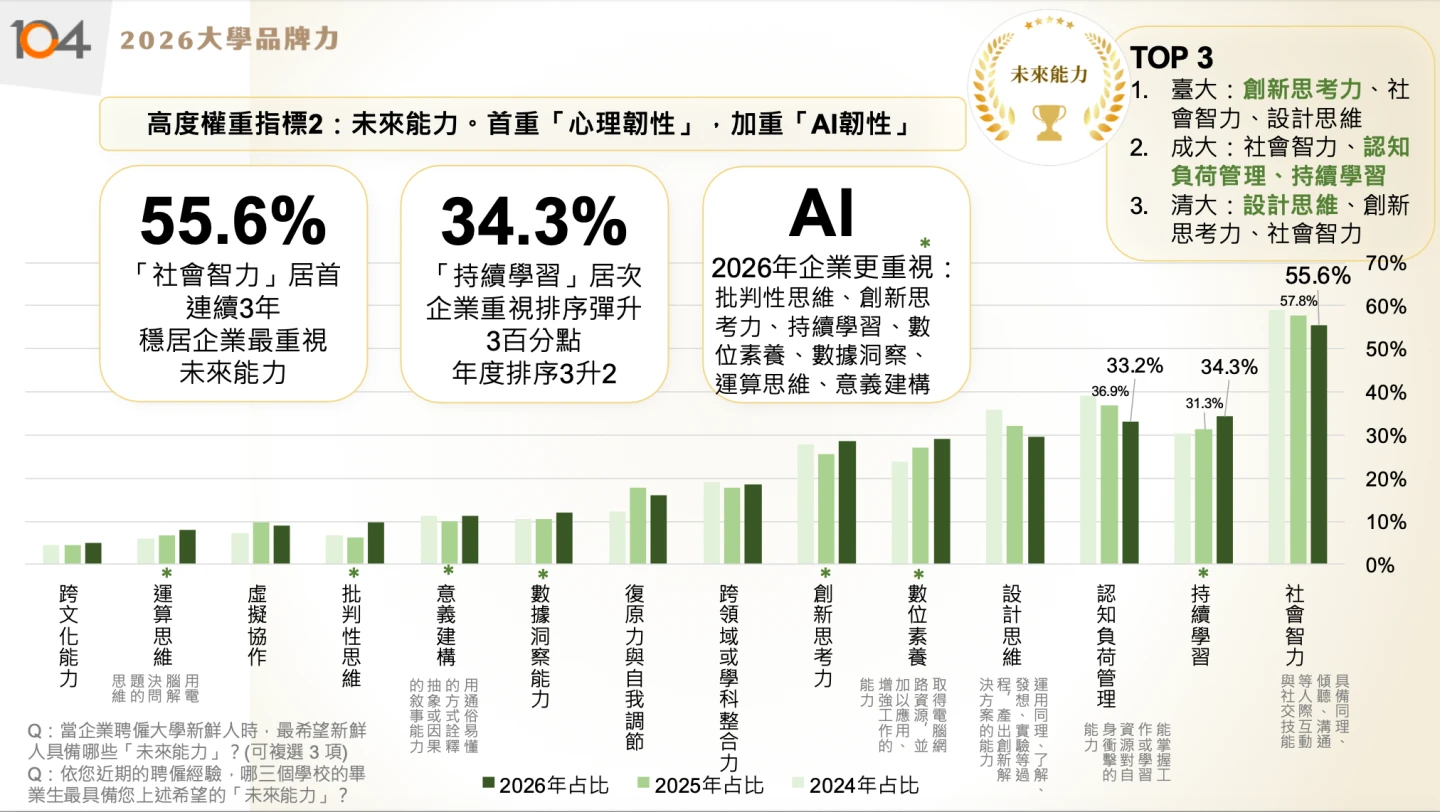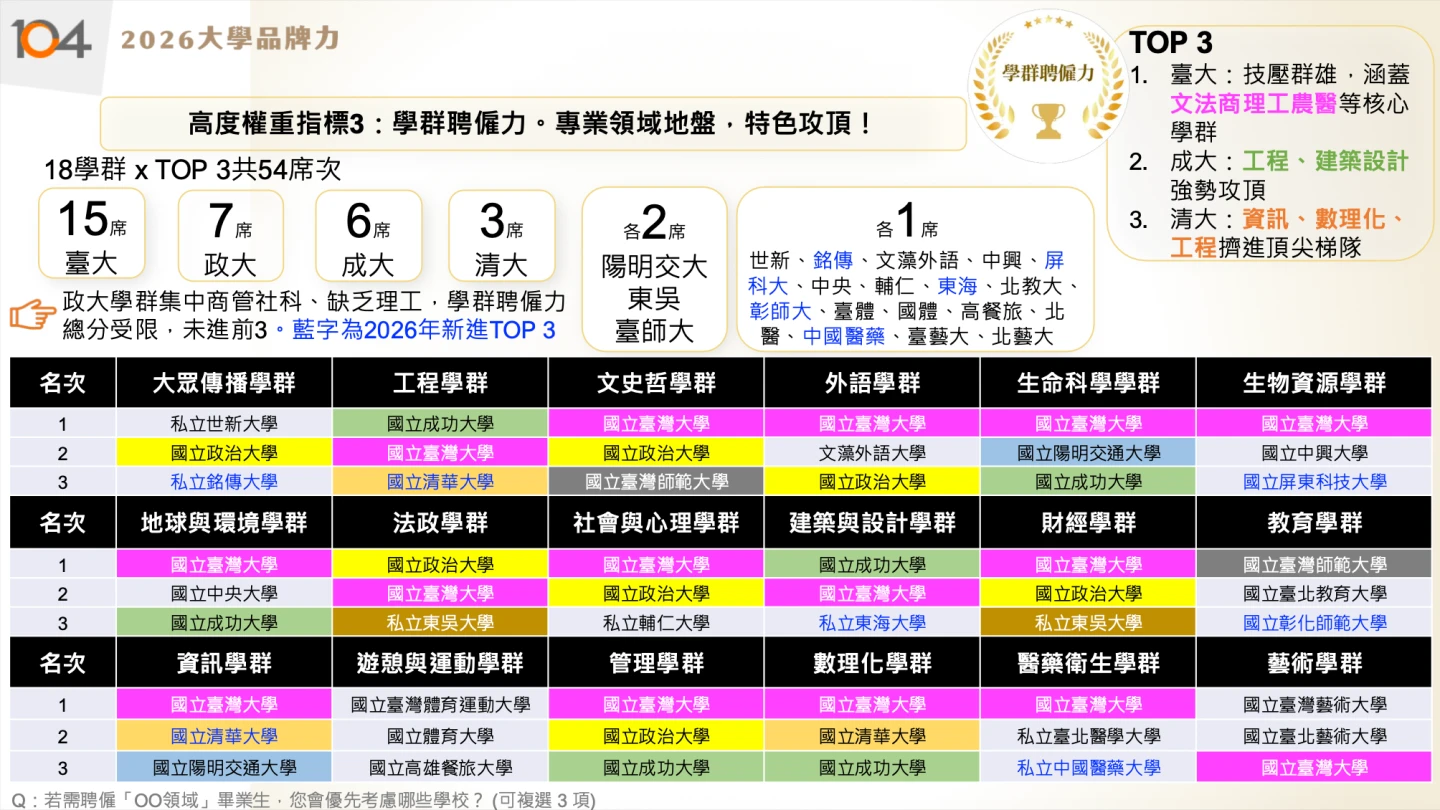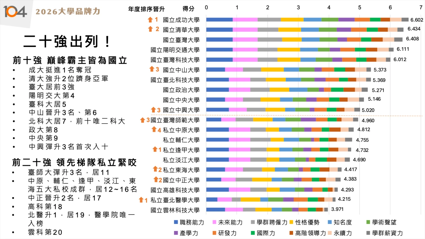 【記者王良博/台北報導】104人力銀行今(7)日公布「2026大學品牌力」評比,前10名均為國立大學,前3名分別為成大、清大及台大,而台科大、北科大則是唯二進入前10名的科大。值得注意的是,企業角度看待大學品牌力,重視軟實力勝過硬實力,軟實力包含未來能力、性格優勢等。