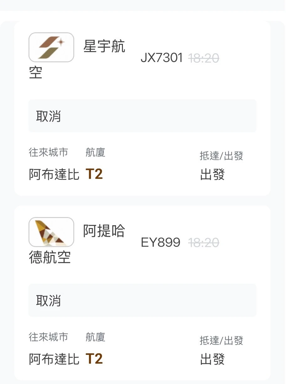 查詢桃園機場網站,今天從桃機飛往阿布達比的阿提哈德航空EY899,以及聯營航班星宇航空JX7301,都顯示航班已取消。