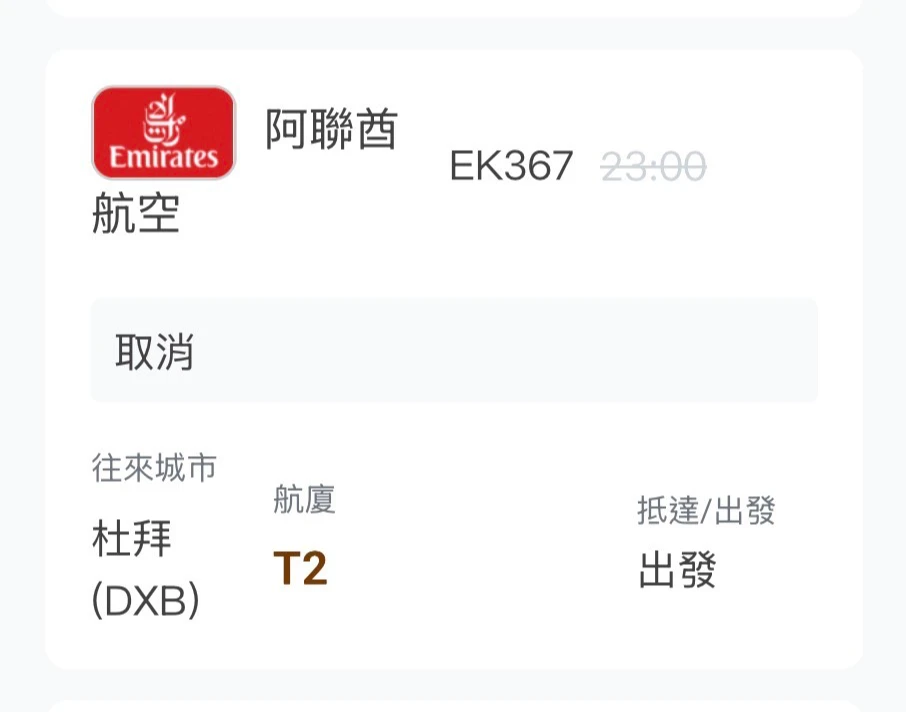 根據桃園機場航班資訊,今天由第二航廈飛往杜拜的EK367航班已經取消。