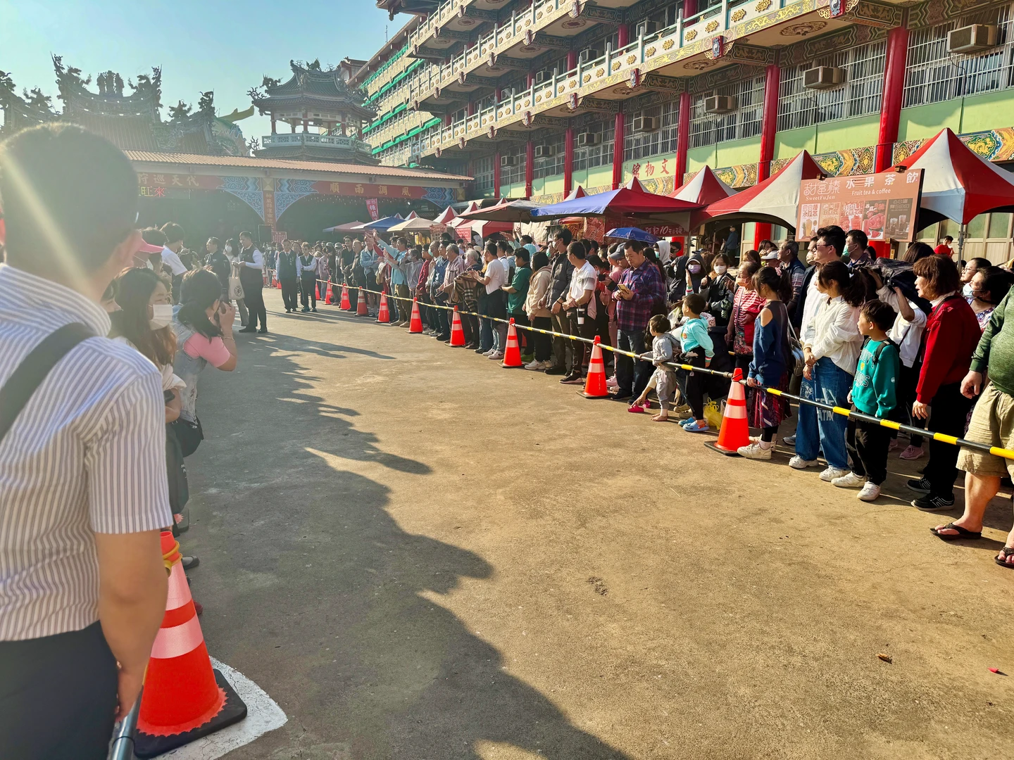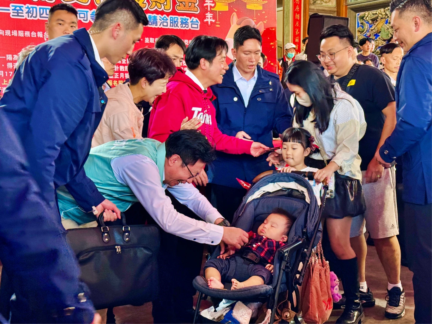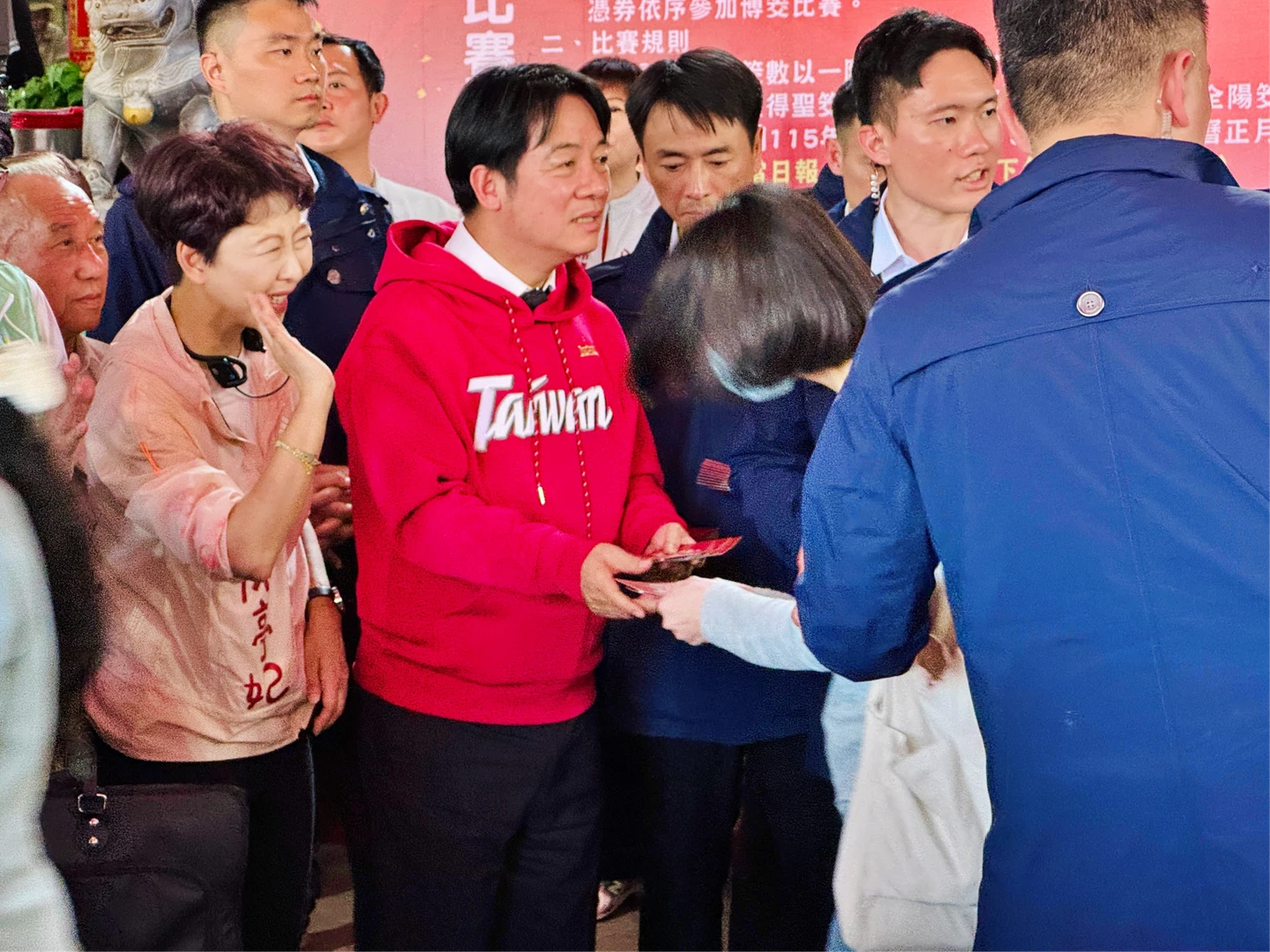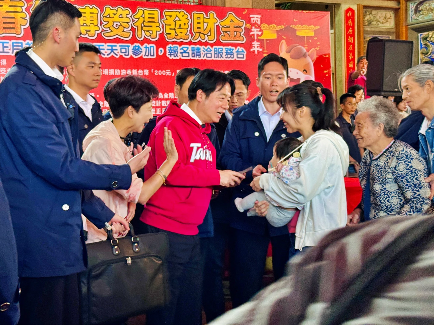 賴清德總統今天下午4時20分在台南市長參選人、立委陳亭妃與郭國文、林宜瑾,以及黨籍市議員陪同下,前往麻豆代天府參拜。廟埕周邊則擠滿領取紅包的人龍,熱情揮手、大聲呼喊「總統好」,氣氛熱絡。