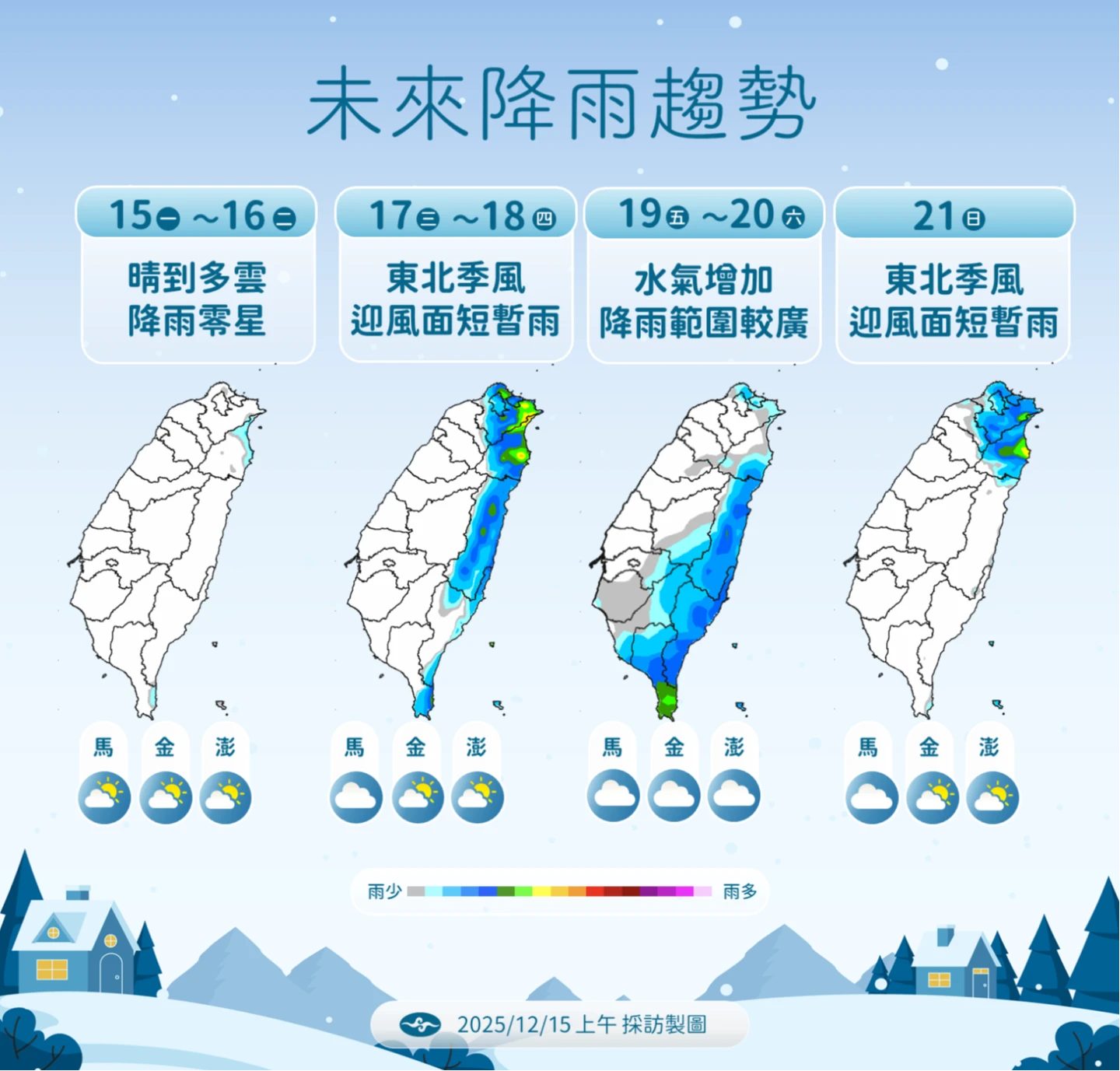 迎風面降雨機率增加,基隆北海岸及東北部地區有短暫雨,有出現局部較大雨勢的可能,東部地區及大台北山區也有局部短暫雨。桃園以北、東南部地區及恆春半島也有零星短暫雨。周四(18日)清晨,中南部地區易有低雲或局部霧影響能見度。