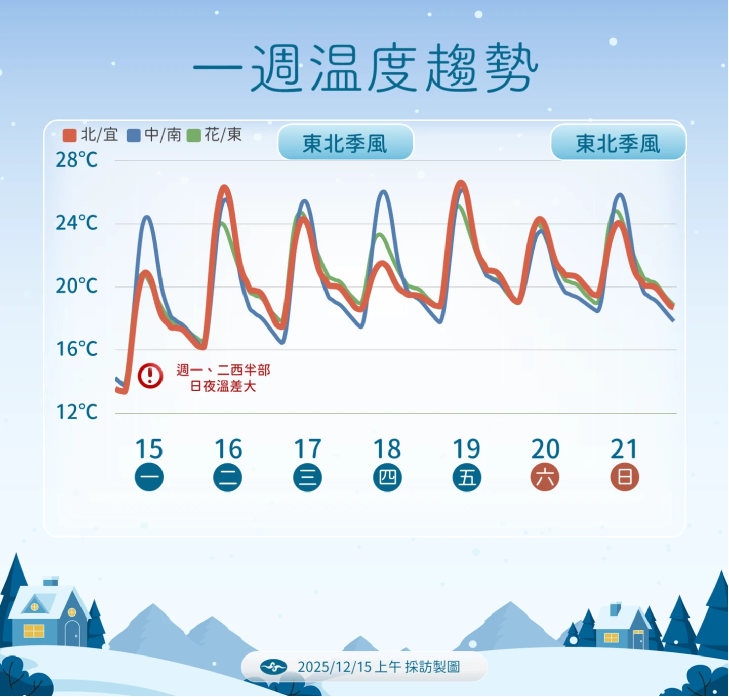 明天(17日)清晨氣溫仍偏低,白天起東北季風將稍增強,持續影響至周四(18日)。在這波影響期間,各地早晚較涼,新竹以南日夜溫差大,預測台灣各地低溫約13°C至20°C。