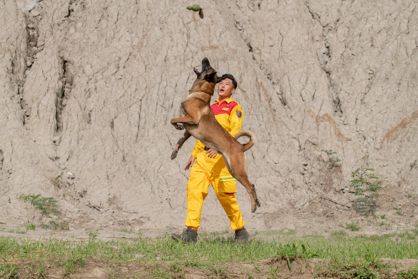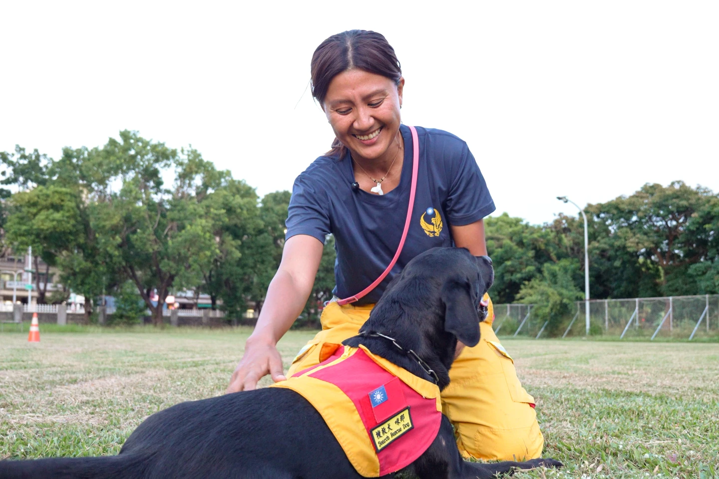 那一年,她還不知道高雄有搜救犬隊。直到四、五年後,學長一句「妳喜歡動物,很適合這個單位」改變她的路。當時犬隊沒缺額,她便利用休假跑去學習,直到去年9月正式加入,與搜救犬「咪娜」成為搭檔。