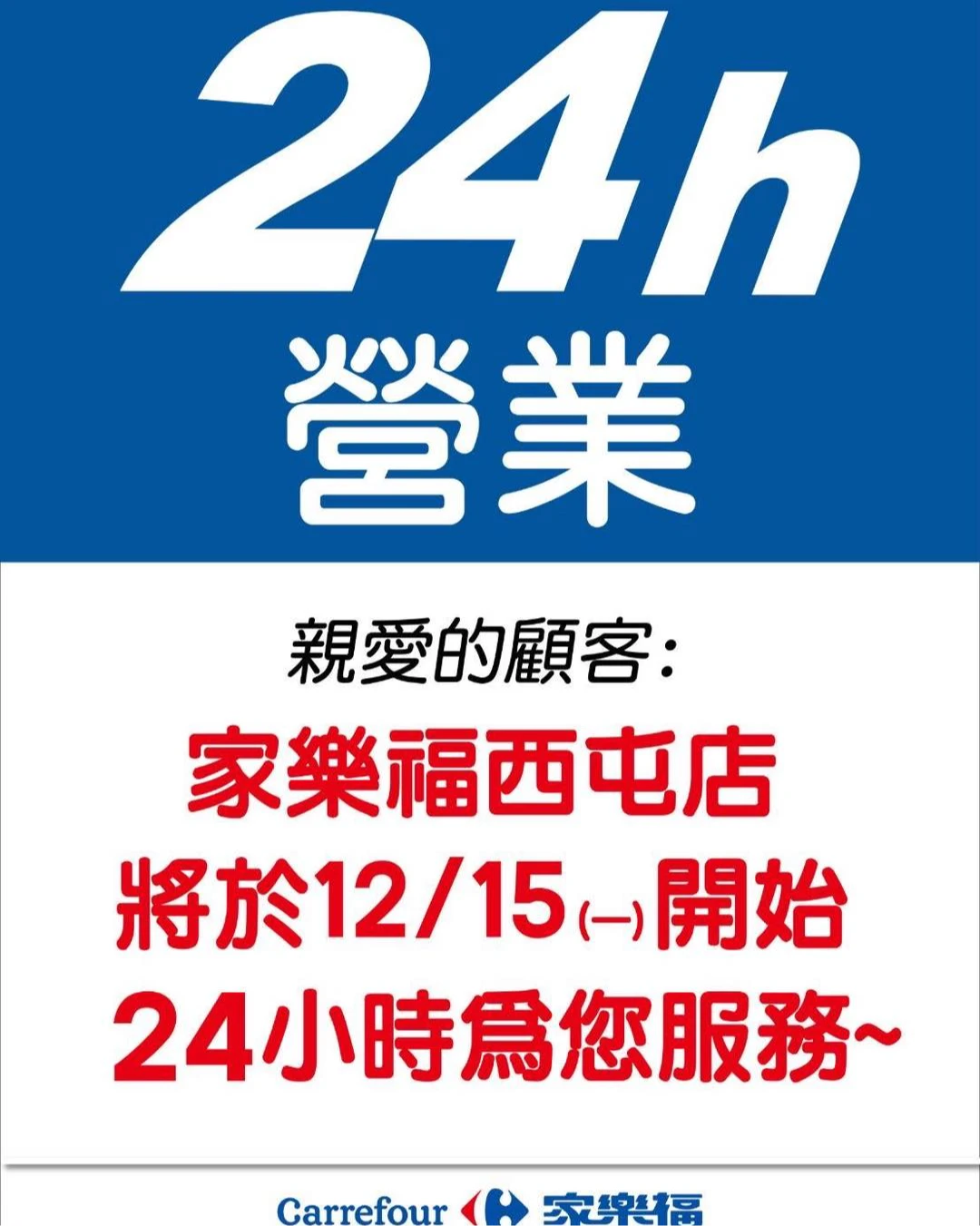 另外,針對家樂福台中青海店將於12月22日熄燈,代表台中唯二的24小時營業家樂福門市少了一間,家樂福表示,台中最大店「西屯店」將於12月15日改為24小時營業。家樂福進一步補充,全台有9間24小時量販門市,其中都會區一定都會有一家,例如台北市有桂林店、新北市有新店店。