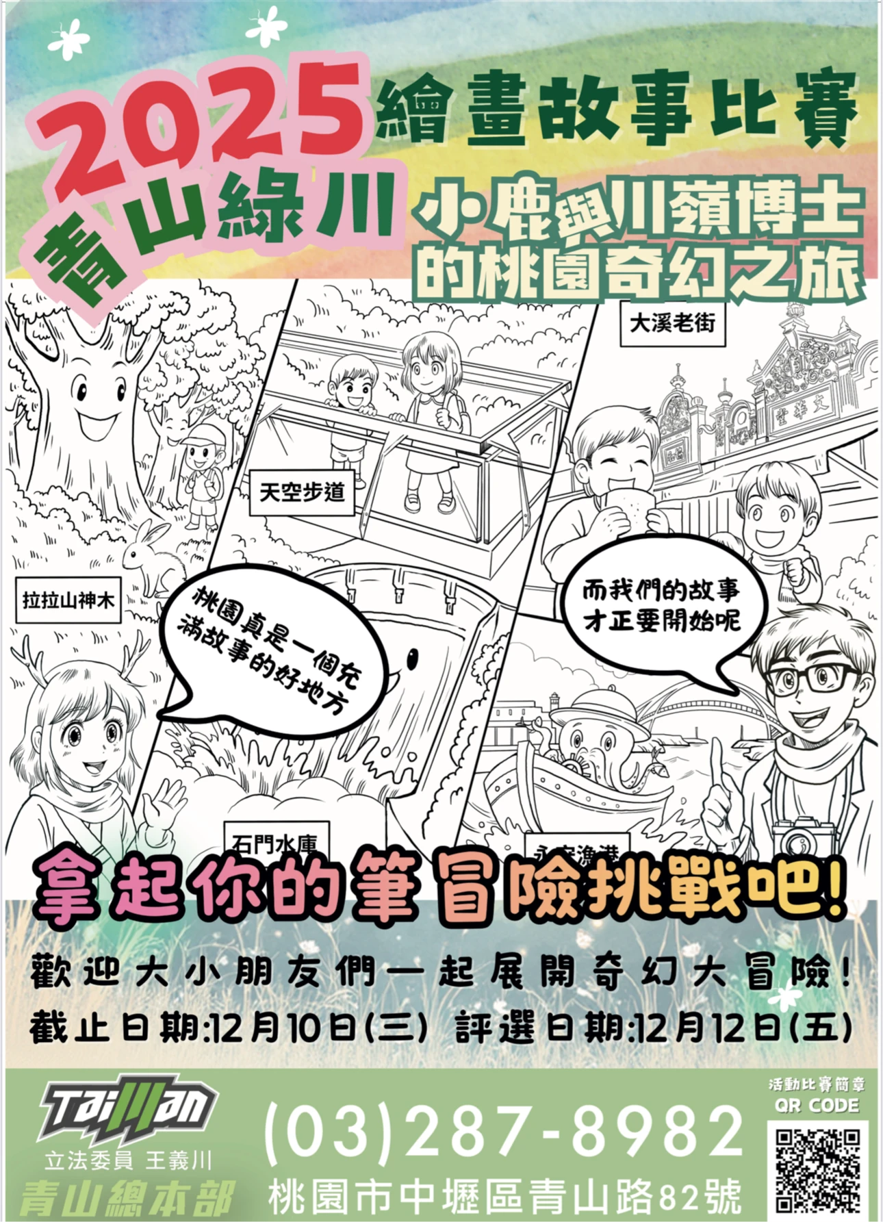 王義川服務處說明,「2025桃園青山綠川繪畫比賽」依年齡規劃參賽組別,包括幼兒組(3~5 歲)、小童組(6~8 歲)、大童組(9~12 歲)以及公開組(13 歲以上),活動自即日起開放,參賽者可前往王義川青山總本部(中壢區青山路82號)領取著色稿。