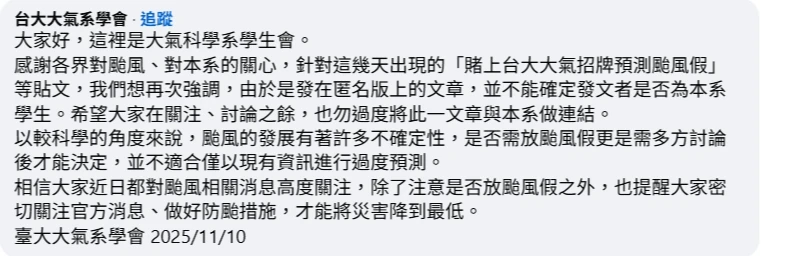 對此,台大大氣系學會表示,針對「賭上台大大氣招牌預測颱風假」等貼文,學生會想強調,由於是發在匿名版上的文章,並不能確定發文者是否為本系學生。希望大家在關注、討論之餘,也勿過度將此一文章與本系做連結。