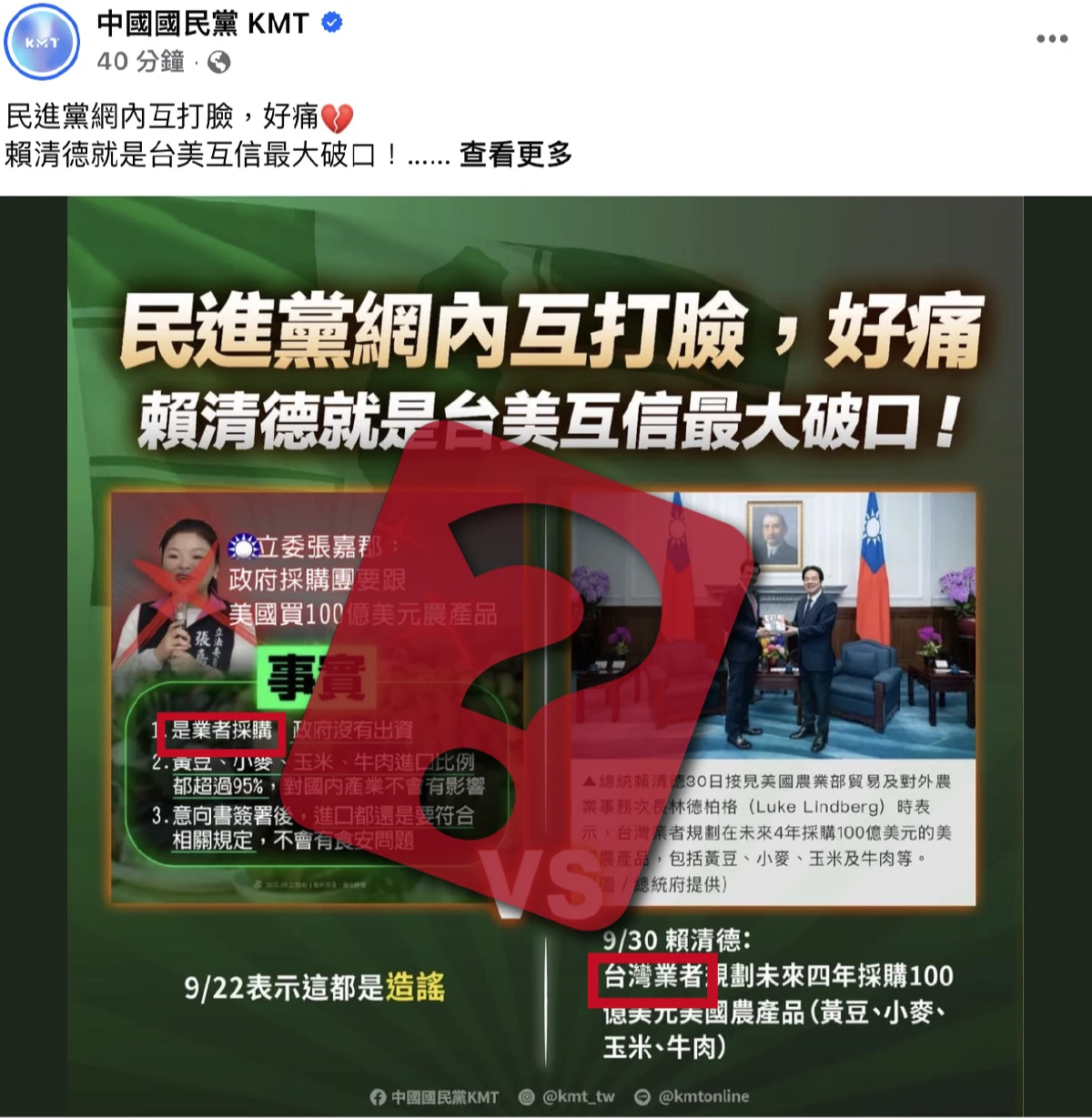 國民黨社群今發佈圖卡,直指民進黨9月22日指控國民黨立委張嘉郡「政府要花100億美元買農產品」內容是造謠,短短幾天,賴清德親口強調。國民黨酸民進黨胡亂澄清,誤導社會大眾。