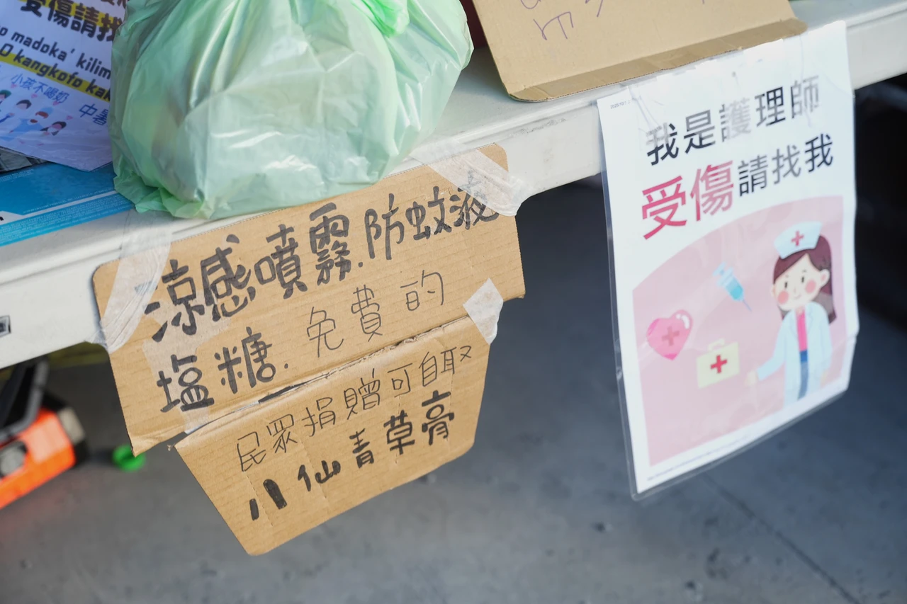 對於救護志工的運作機制,Patty指出,他們在災區設下6個救護站,分別位於敦厚路、光復國小、佛祖街等處,隨時都有人駐點提供民眾救護服務,另外,還有一些人是機動組成員,會攜帶棉棒等耗材到處走動,身上也會掛有明顯的識別,這些救護志工可以提供簡易包紮、頭暈時量測血壓等。